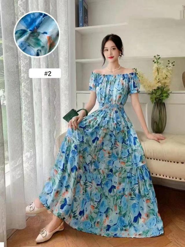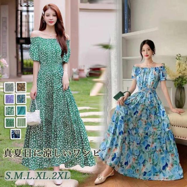 夏ワンピース リゾートワンピ サマーワンピース 肩見せ オフショルダー 大人可愛い マキシワンピース 大きサイズ ビーチ 結婚式 二次会 パーティー 花柄 カジュアル ゆったり