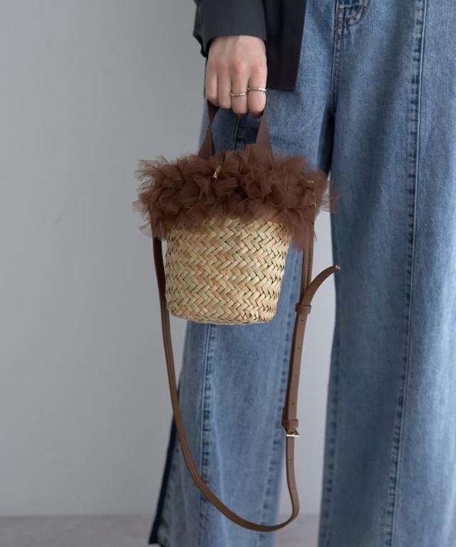 バレエのチュチュを連想させるふんわりチュールフリンジが華やかなミニカゴバッグ。グログランリボン仕様のハンドルが上品ななニュアンスをプラス。長さ調節と取り外し可能な合皮ストラップ付きでショルダーバッグとしても使える2WAYデザイン。巾着タイプで使いやすく、持つだけでコーディネートにインパクトをプラスしてくれるアイテムです。