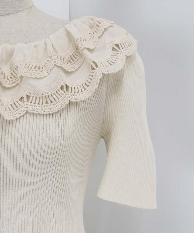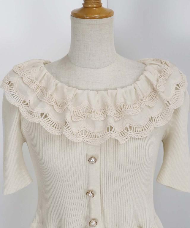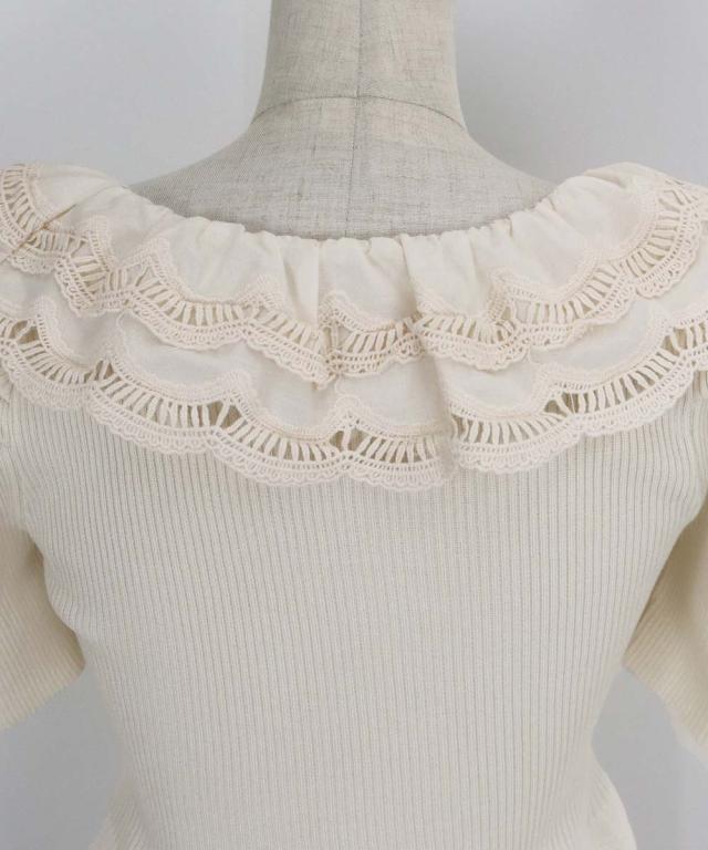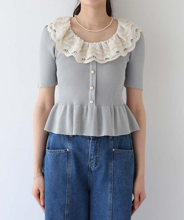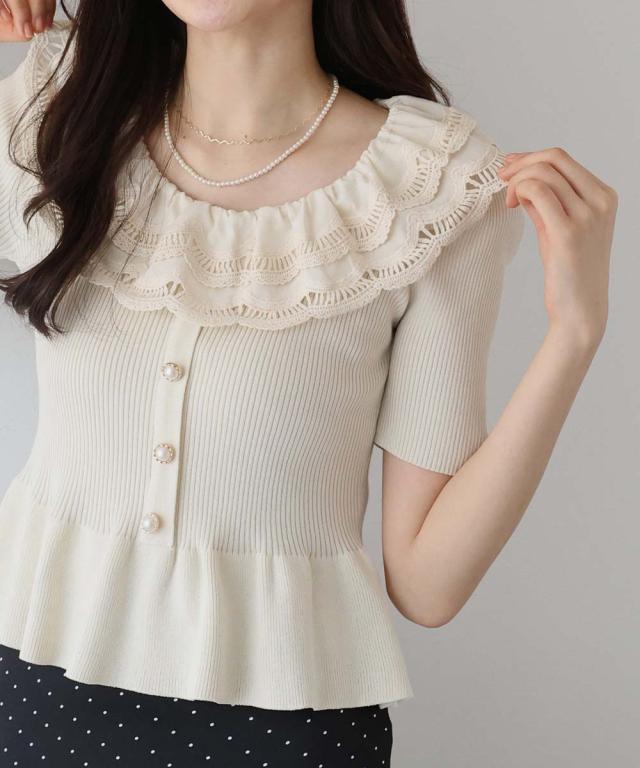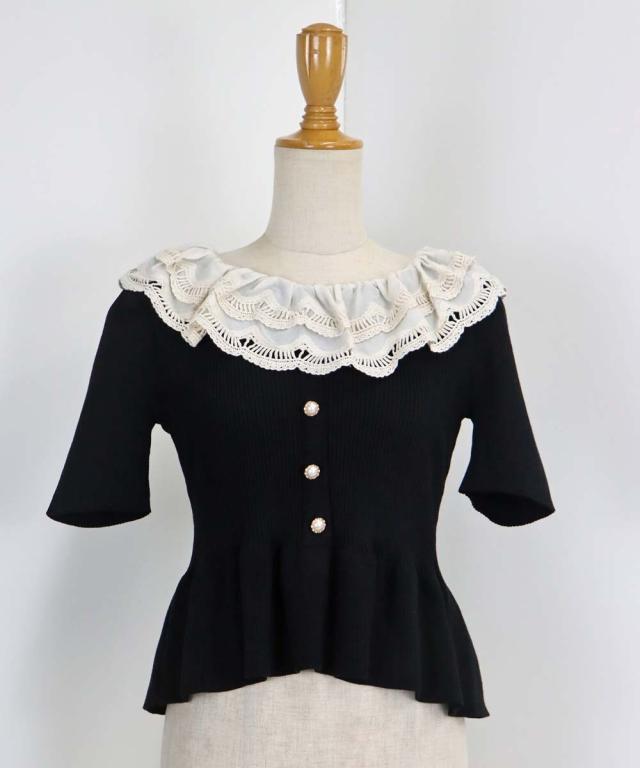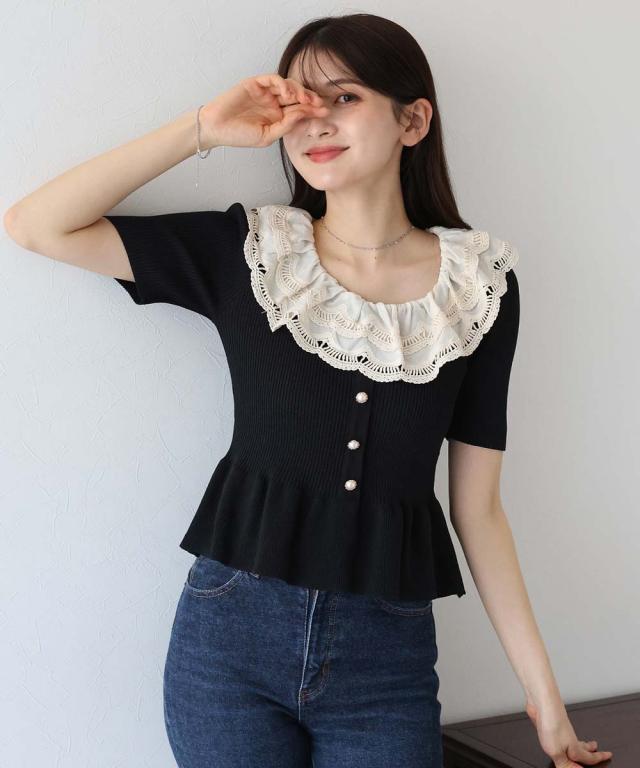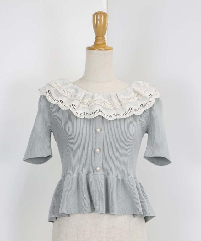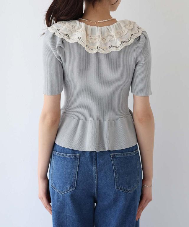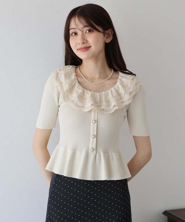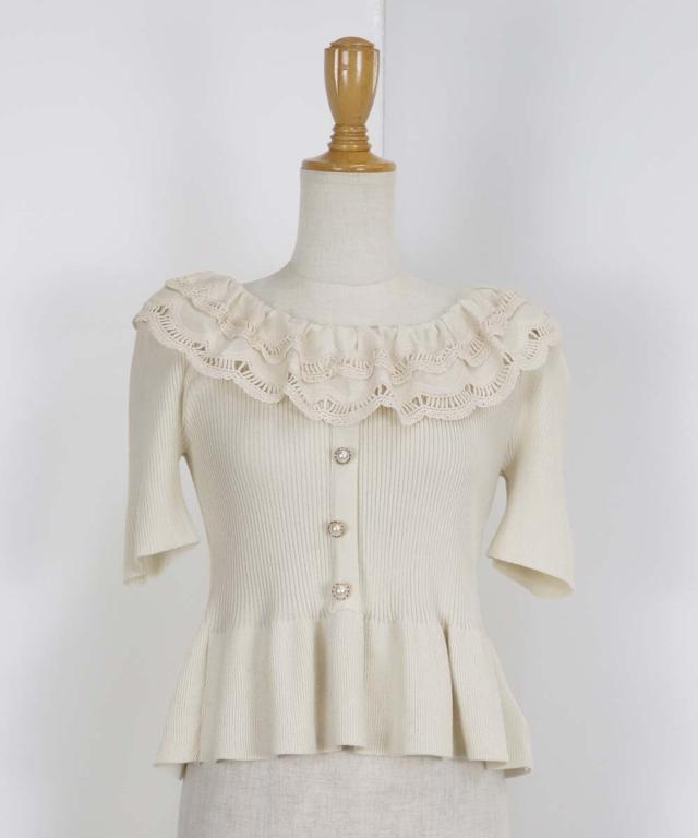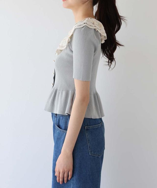 レース襟がガーリーな雰囲気のペプラム半袖ニット