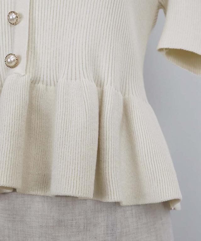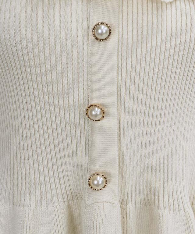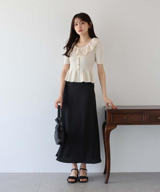 刺繍レースや金縁パールボタン、ペプラムシルエットなどガーリーな要素がたっぷり詰まった半袖ニット。