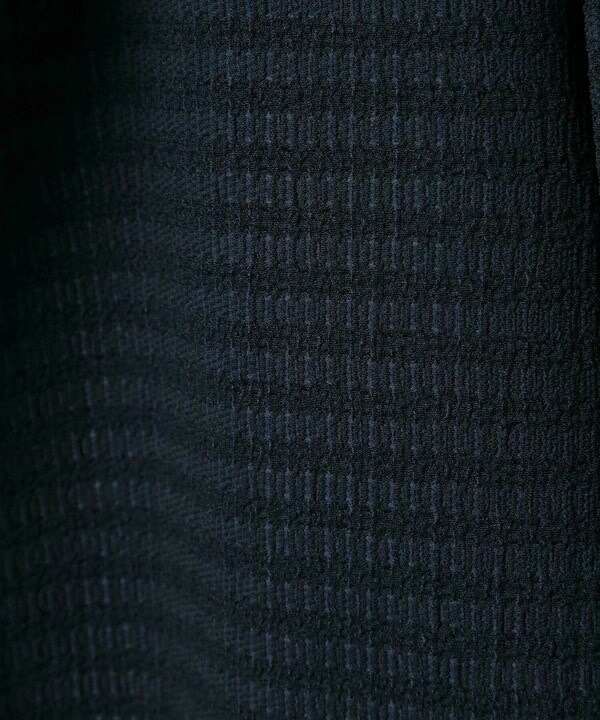 経編(たてあみ)のトリコットジャージ素材を使用した、ラッセル編みの程よい凹凸感のある生地です。ストレッチ性・形状安定性も高いため、洗濯後の形状変化が少なくシワになりにくいのが特徴です。一般的なジャージ素材に比べてハリがあり、シルエットが美しく出るのも嬉しいポイントです。