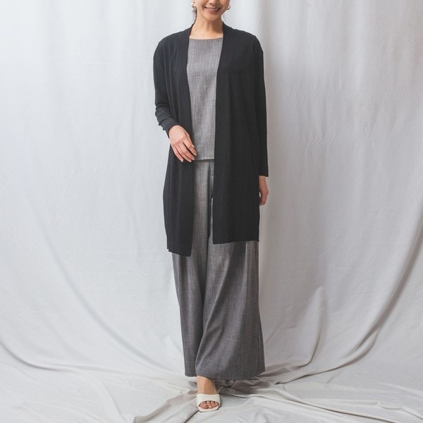 布帛を組み合わせた定番の異素材MIXロングカーディガン。さらっとラフに羽織ることができるオープンフロントデザイン。後ろ身頃を軽やかな布帛地で切り替え、裾のセンタースリットで抜け感のある印象に。共布リボンのウエストマークが、スタイルアップ効果も後押ししてくれます。ミニマルなデザインでスタイリングにも取り入れやすい、ワードローブに是非取り入れたいアイテムです。