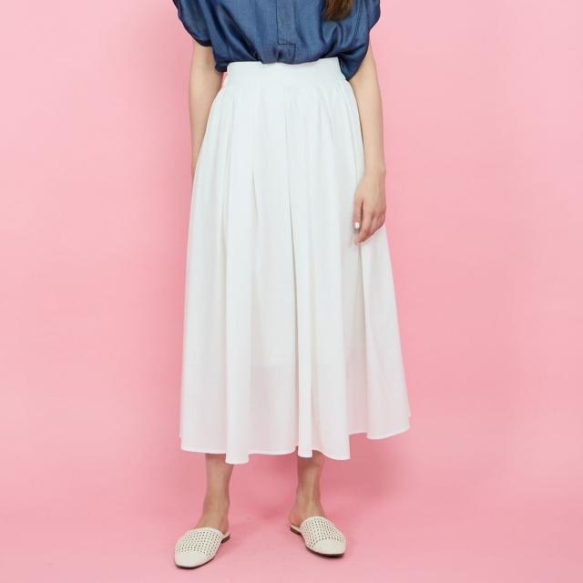 たっぷりのウエストタックプリーツデザインでフレアシルエットを描く軽量スカート。