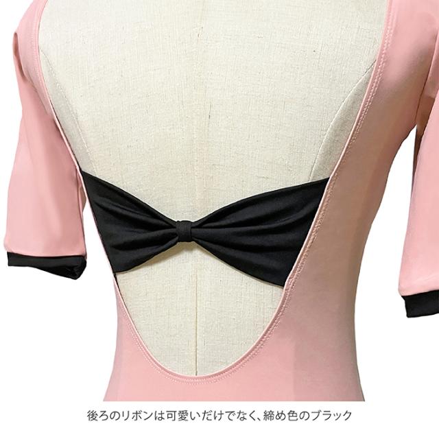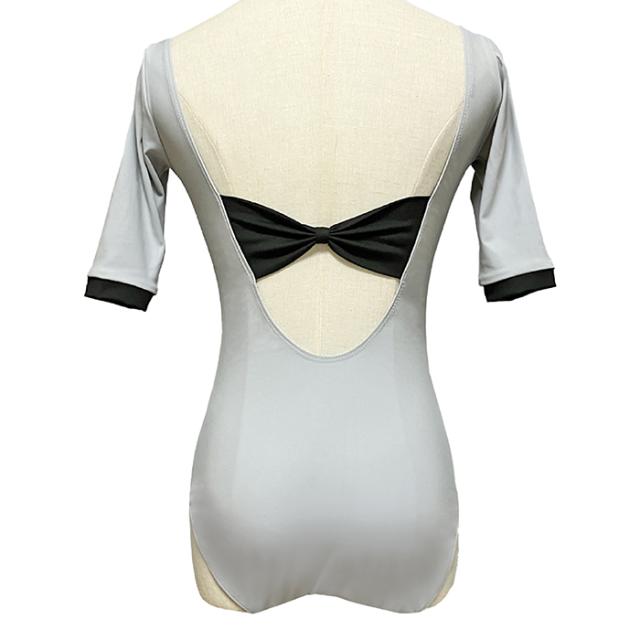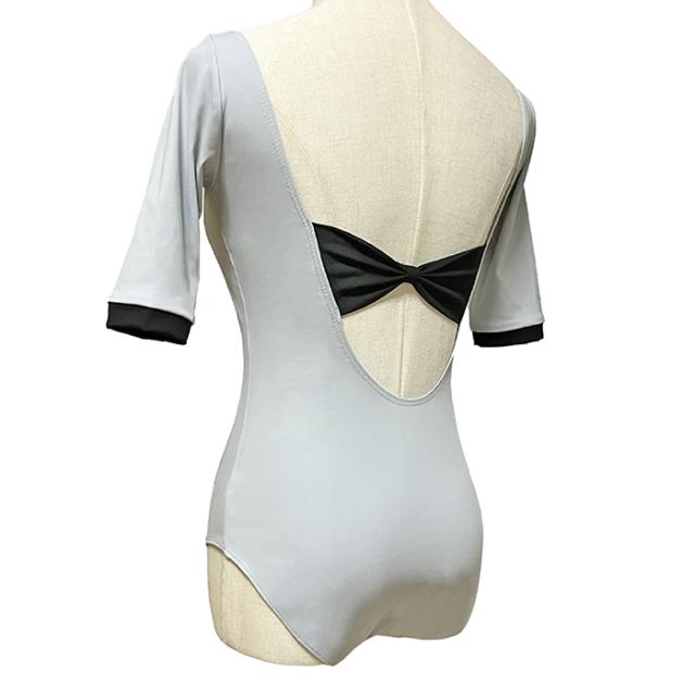 締め色の黒が、袖裾と背中のリボンに使われており、シンプルなレオタードを個性的に彩ります。