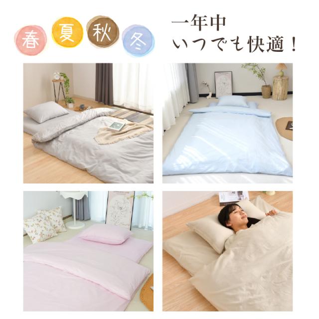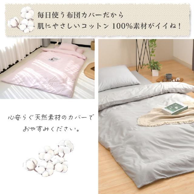 選べる4色 心安らぐ天然素材の綿100%カバーでおやすみください。 綿100%の布団カバーは、天然素材ならではのやさしい肌ざわりが魅力。触れた瞬間からふんわりと心地よく、まるで肌に寄り添うような安心感があります。敏感肌の方やお子さまにもおすすめで、毎日の眠りをやさしく包み込みます。洗うほどに風合いが増し、肌になじんでいくのも嬉しいポイント。 吸水性・通気性に優れ、さらっと快適な寝心地! 静電気が起きにくく、ほこりが付きにくい! 丈夫で長持ち オールシーズン使えます 丸洗いOKで衛生的! 全開ファスナー式で、カバーの付け替えの手間が軽減します。 8ヶ所ヒモ付きで掛け布団のズレを防止します。 やさしい落ち着いた色合いのカバーです。「ミストグレー」「フロスティピンク」「エクスベージュ」「パウダーブルー」の4色です。 |