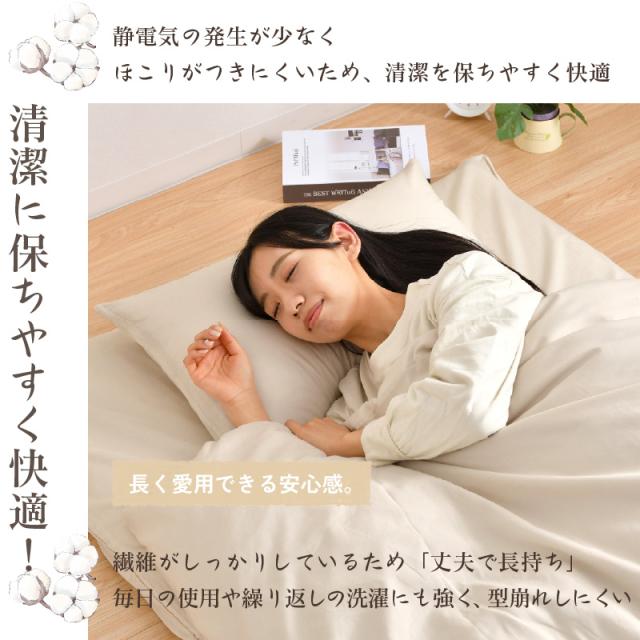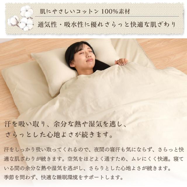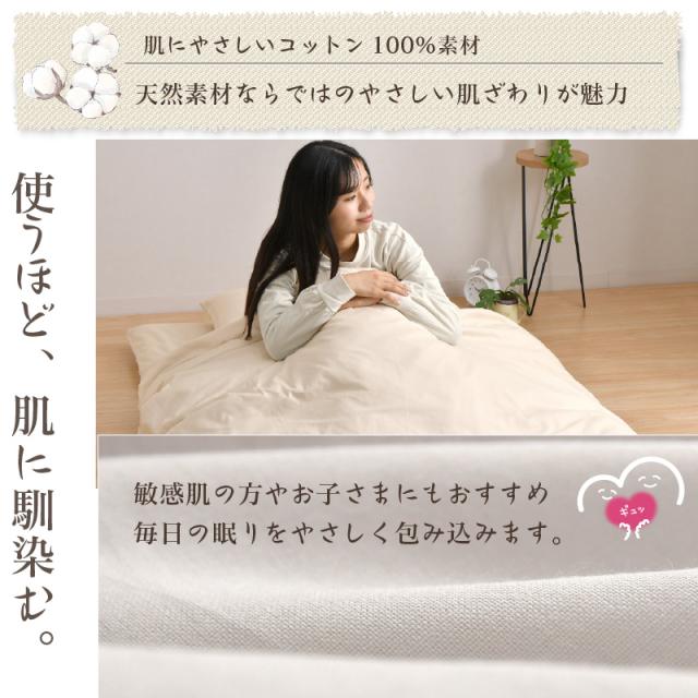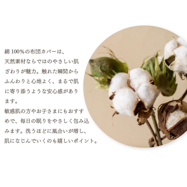 綿100%の布団カバーは、天然素材ならではのやさしい肌ざわりが魅力。触れた瞬間からふんわりと心地よく、まるで肌に寄り添うような安心感があります。敏感肌の方やお子さまにもおすすめで、洗うほどに風合いが増し、肌になじんでいくのも嬉しいポイント。