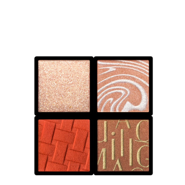 | <カスタマイズケースへのセット方法> 本品の透明ケース内の中皿を1色ずつそっと取り外し、セットしてください。その際、中味を削らないようにご注意ください。 <おすすめのご使用法> ●指先またはお手持ちのチップにとってご使用ください。 (1)右上の色:アイホール全体に広げます。 (2)左下の色:広くぼかしたり、目尻にポイントでいれて、ニュアンスを演出します。 (3)右下の色:運命のブラウンカラーをまぶたの際に沿ってのせて、ぼかします。 (4)左上の色:アイホール中心、下まぶた、目頭などにのせて輝きをプラスします。 |