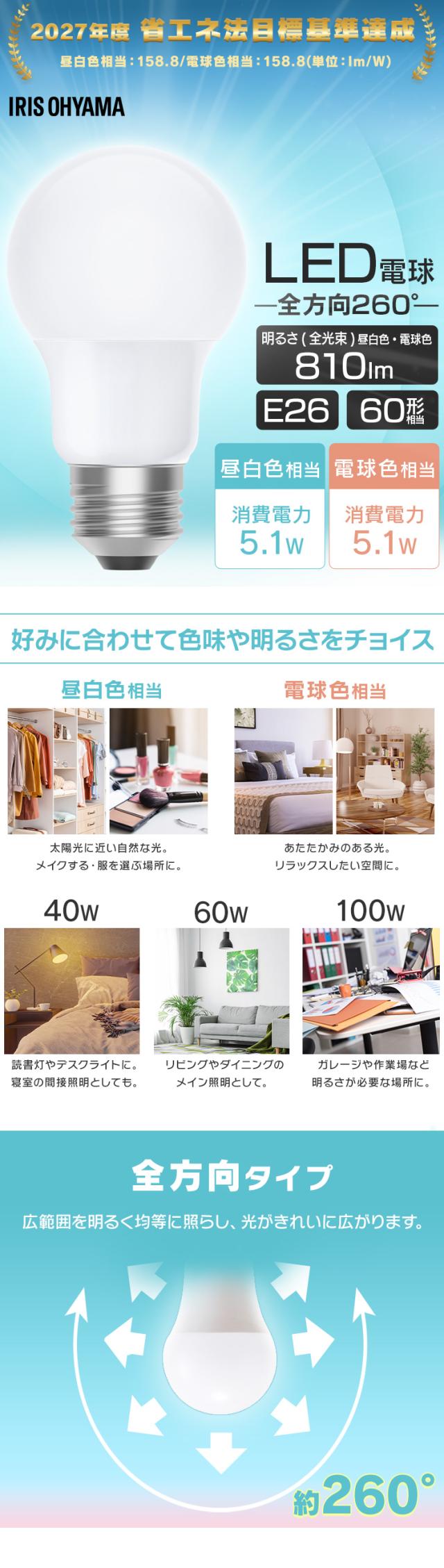 [検索用:4個 led電球 e26 60w 相当 昼白色 電球色 全方向タイプ 5年保証 LED 電球 E26 アイリスオーヤマ 4967576773461 4967576773478]