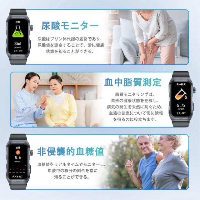 2025最新 スマートウォッチ 血糖値 血圧測定 血中酸素 尿酸 血中脂質 心拍数 BMI 心電図 睡眠監視 体温検知 呼吸訓練 女性生理管理 リモートケア 天気予報 多運動モード 文字盤自由設定 通話機能付き 着信&メッセージ通知 iphone Android対応 磁気吸引充電 日本語説明書付き 腕時計 日本製 プレゼン メンズ/レディース スポーツウォッチ 贅沢ギフト 父の日 母の日 敬老の日 誕生日 夏祭り