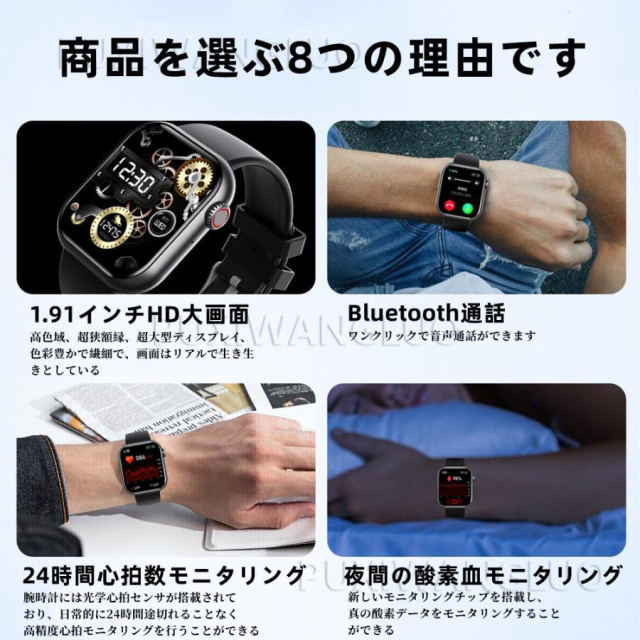 【1.91インチHD大画面&多機能なスマートウォッチ】1.91インチのフルタッチパネル、より大きく高精度な大画面で鮮やかな色合いと読みやすさを実現しました。明るさを自由に調整できます。スマートウォッチには音楽制御、通話機能、メッセージ通知、天気予報、カメラ制御、アラーム、腕上げ点灯、スマホ探し、ストップウォッチなど充実の機能を搭載して、日常生活をより便利にします。オフィス仕事や在宅勤務など必要な座りがち注意、水飲み通知機能付きます。