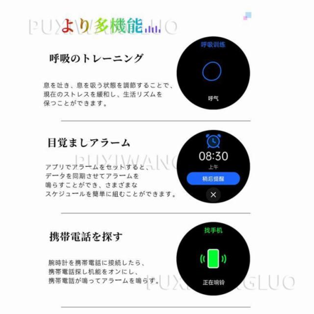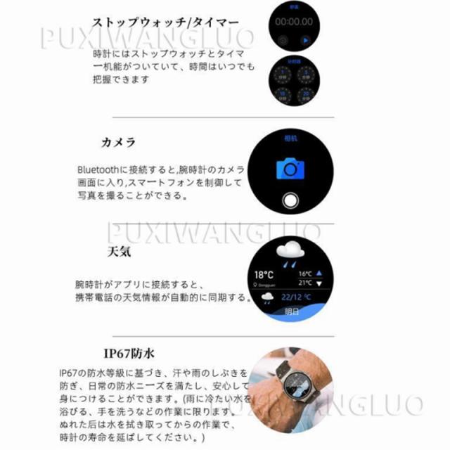 【便利な通知機能】 スマートウォッチをスマホに接続した後、着信をリマインダー、重要なSMSメッセージを受信して読めますように振動します。満員電車の中、運動中や打ち合わせ中などスマホを取り出せない状況でも、大切なメッセージや着信を見逃しません。(Line、Twitter、Facebook(Meta)、Instagramなどをサポートします。)お休みモードも設定でき、寝る前に「振動」「メッセージ通知」をオフすることができます。(ご注意:電話をかけるや返信などの機能がいただけません)
