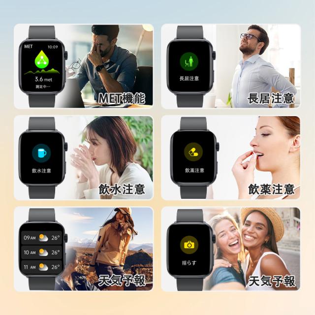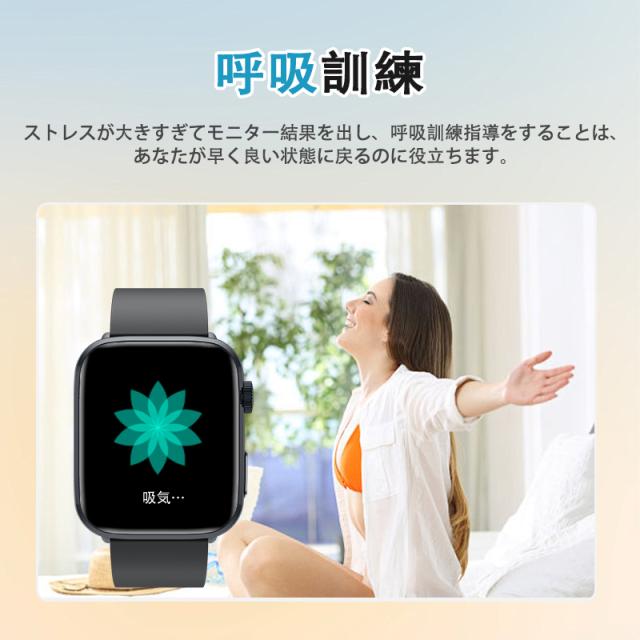 【1.81インチHD大画面&多機能なスマートウォッチ】1.81インチのフルタッチパネル、より大きく高精度な大画面で鮮やかな色合いと読みやすさを実現しました。明るさを自由に調整できます。スマートウォッチには音楽制御、通話機能、メッセージ通知、天気予報、カメラ制御、アラーム、腕上げ点灯、スマホ探し、ストップウォッチなど充実の機能を搭載して、日常生活をより便利にします。オフィス仕事や在宅勤務など必要な座りがち注意、水飲み通知機能付きます。