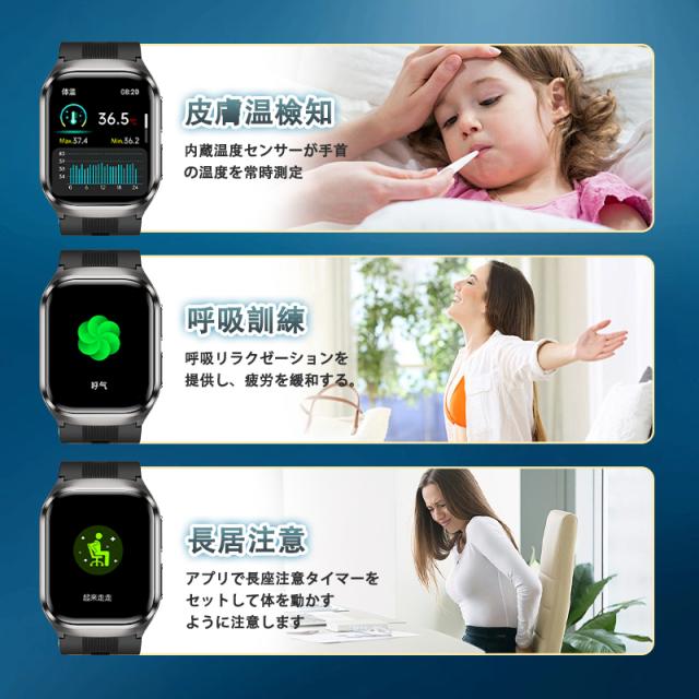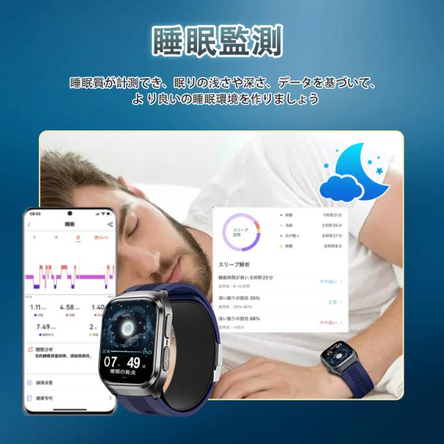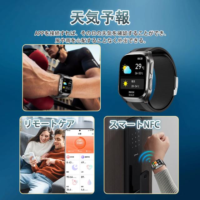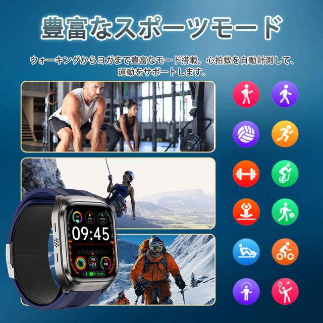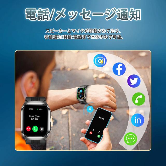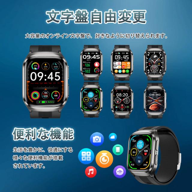 【Bluetooth5.3通話機能&音声アシスタント】スマートフォンとBluetooth接続すれば、電話の受信と応答を行うことができます。大切な電話を逃すことはありません。※※専用アプリと接続するとス マートウォッチで直接に電話をかけることや着信拒否も実現可能。運転中でも運動中でも両手を解放し、より効率的な通話ができます。音声アシスタント機能を搭載しており、スマートウォッチに話しかけるだけで音楽をかけてくれたり、アラームを設定してくれたり、スポーツモードを開始したりするなどの操作を実行できます。