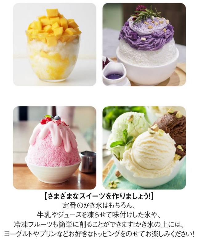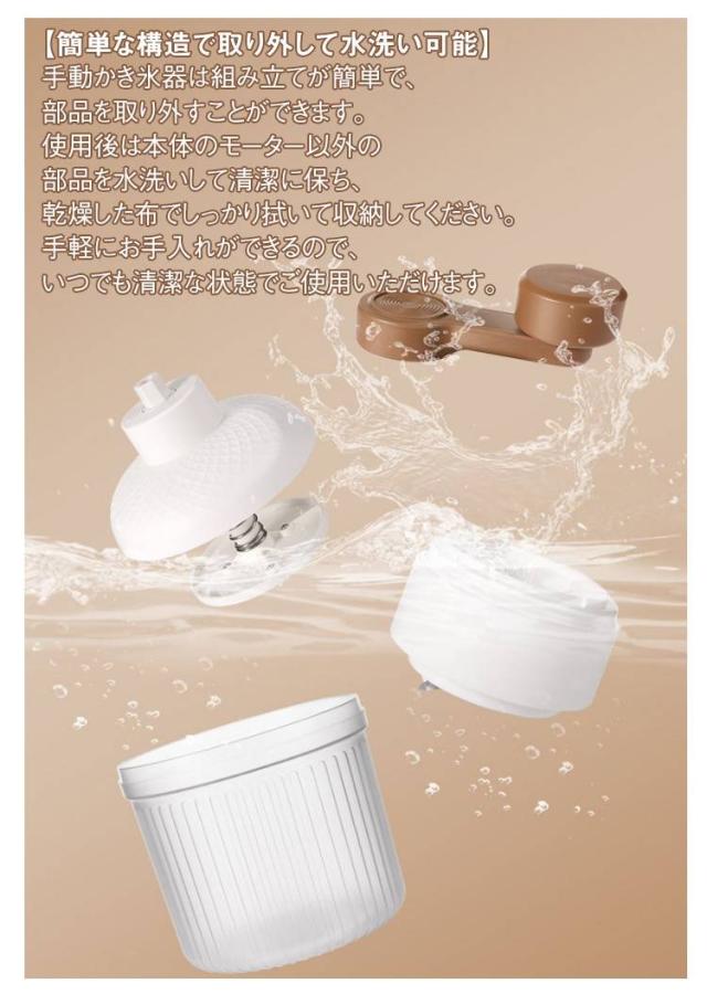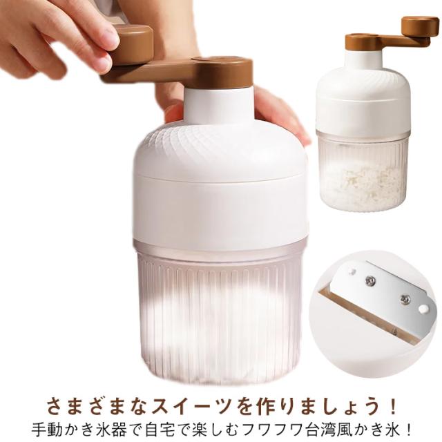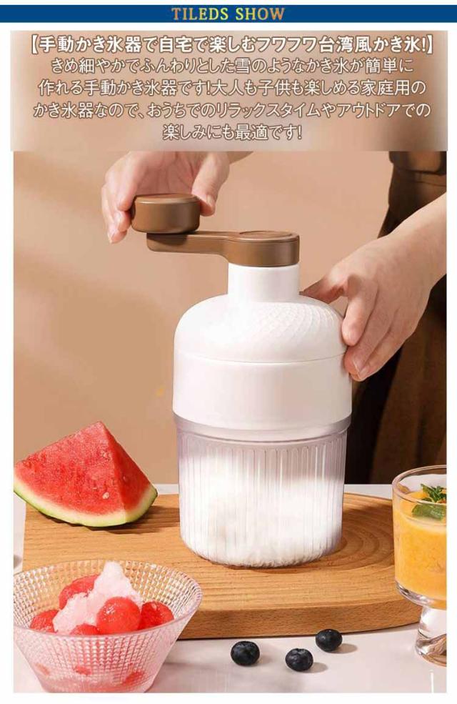 | 【手動かき氷器で自宅で楽しむフワフワ台湾風かき氷!】きめ細やかでふんわりとした雪のようなかき氷が簡単に作れる手動かき氷器です!大人も子供も楽しめる家庭用のかき氷器なので、おうちでのリラックスタイムやアウトドアでの楽しみにも最適です! 【さまざまなスイーツを作りましょう!】定番のかき氷はもちろん、牛乳やジュースを凍らせて味付けした氷や、冷凍フルーツも簡単に削ることができます!かき氷の上には、ヨーグルトやプリンなどお好きなトッピングをのせてお楽しみください! 【手動式でDIYの達成感を味わいましょう】手動かき氷器はハンドルを回すことでスピードや圧力を微妙にコントロールできます。自分で回すことで、出来上がったかき氷の達成感を感じることができますし、お子さんと一緒に楽しみながら作ることもできますので、手動かき氷器の魅力ですね! 【簡単な構造で取り外して水洗い可能】手動かき氷器は組み立てが簡単で、部品を取り外すことができます。使用後は本体のモーター以外の部品を水洗いして清潔に保ち、乾燥した布でしっかり拭いて収納してください。手軽にお手入れができるので、いつでも清潔な状態でご使用いただけます。 【使い方】付属の製氷カップで作った氷をケースに入れてハンドルを横に回すだけ!手回しすることで、自分のペースでかき氷を作ることができます。 | |