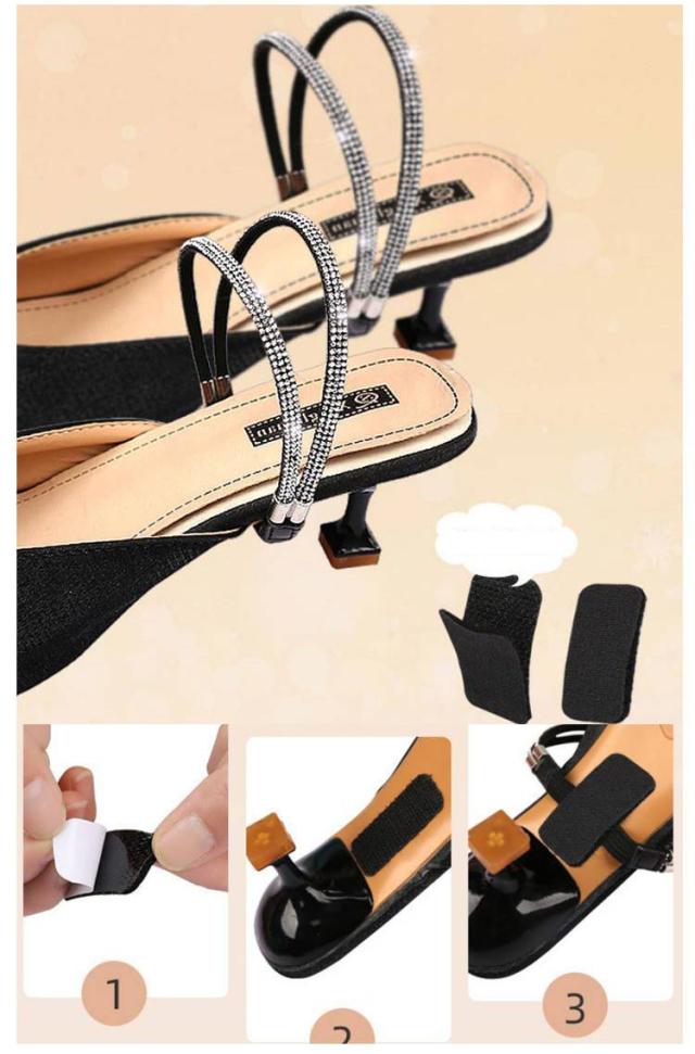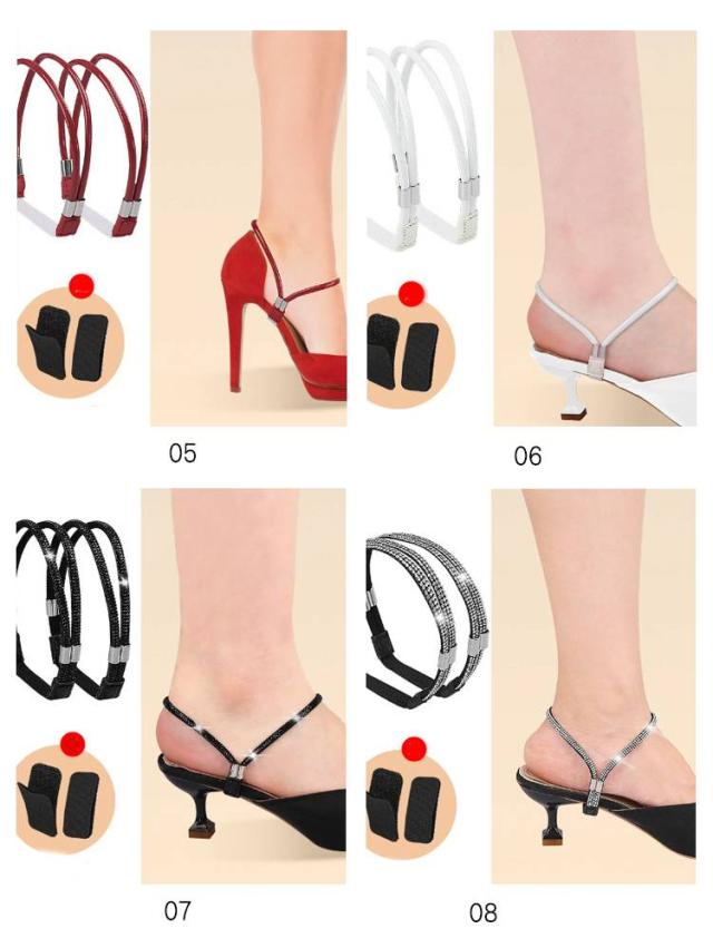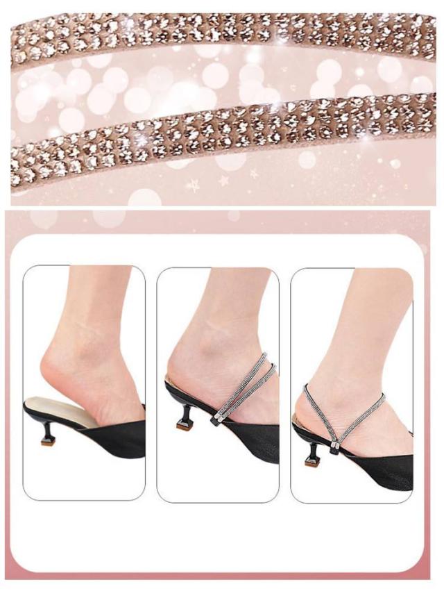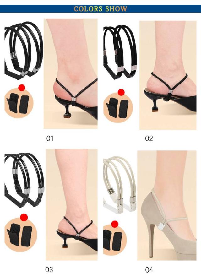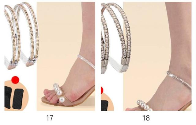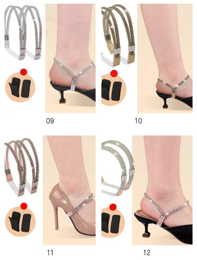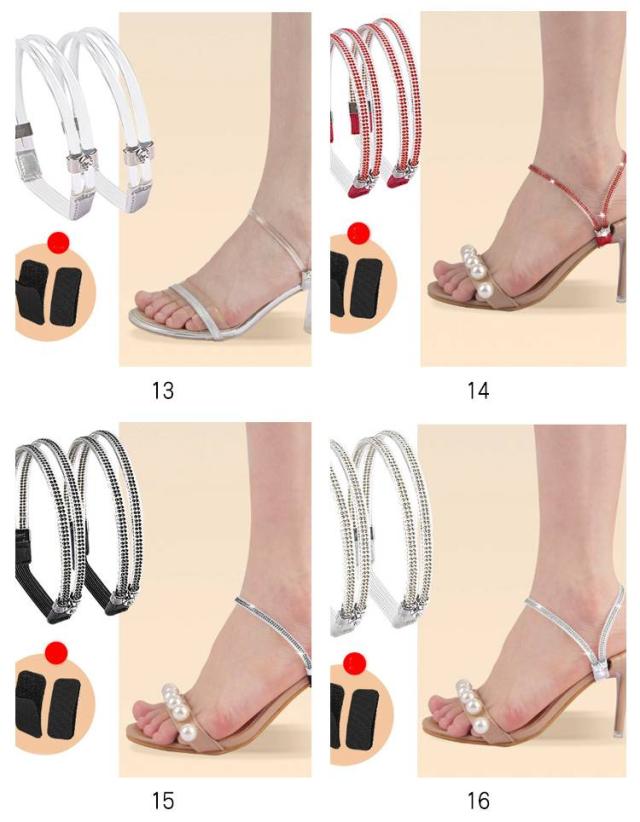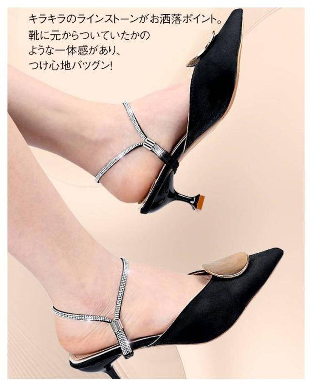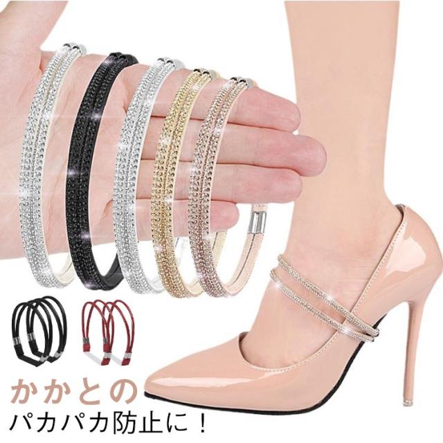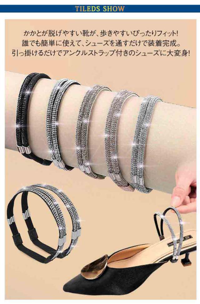 | かかとのパカパカ防止に! かかとが脱げやすい靴が、歩きやすいぴったりフィット! 誰でも簡単に使えて、シューズを通すだけで装着完成。 引っ掛けるだけでアンクルストラップ付きのシューズに大変身! 靴に元からついていたかのような一体感があり、つけ心地バツグン! キラキラのラインストーンがお洒落ポイント。 パンプスはもちろん、ヒールのあるサンダルやミュールにもお使いいただけます! | |