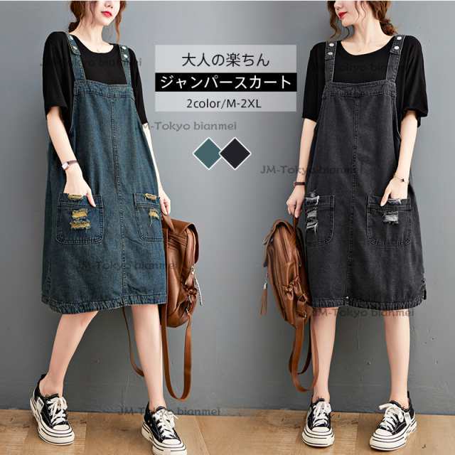 夏新作 ジャンパースカート レディース サロペットデニム スカート 大きいサイズ ワンピース 膝丈 袖なし夏 ドッキングワンピース Aライン 体型カバー 黒ワンピース デニム 無地 きれいめ オールインワン 着?せ ブルー ブラック M-2XL 大人 20代 30代 40代