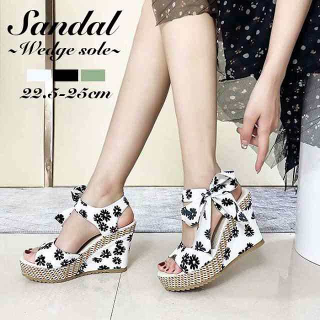 ウェッジソールサンダル お花モチーフ リボン キュート ガーリー フラワー 厚底 女性 ラブリー 夏 ビーチ リゾート 22.5cm-25cm ヒール10cm