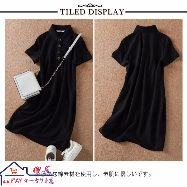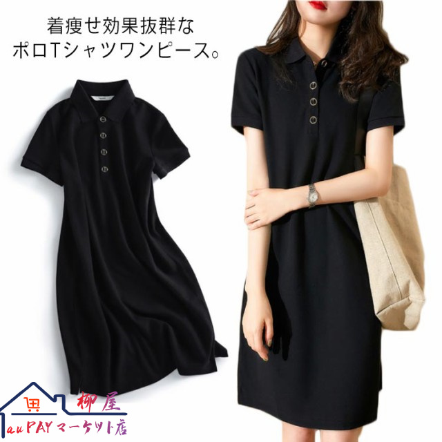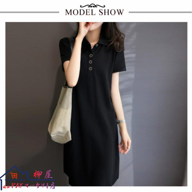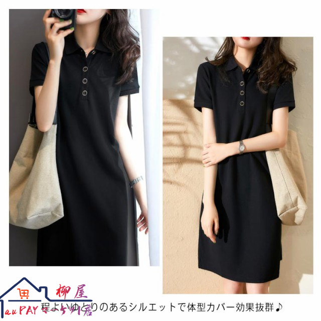 シャツワンピース レディース きれいめ 膝丈ワンピース 春夏 半袖ワンピース ポロ襟スカート ロング丈POLOシャツ 体型カバー 着痩せ ゆったり スリット オシャレ 韓国風 カジュアル 通勤OL 黒 30代 40代