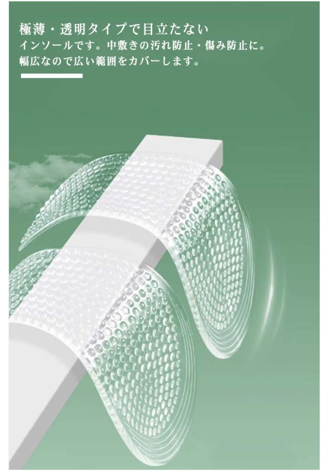 | 4足組セット 夏のおしゃれを快適にサポートするサンダル用多機能中敷。 極薄・透明タイプで目立たないインソールです。中敷きの汚れ防止・傷み防止に。幅広なので広い範囲をカバーします。 汚れが気になったら外して洗えるので、サンダル等、素足履きでもOKです クッション性と吸汗性に優れ、滑り止め機能で安定感を提供。 ハイヒールでも痛みを軽減し、一日中快適に。 | |