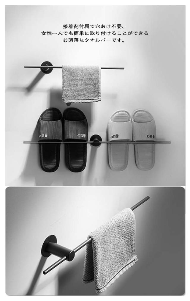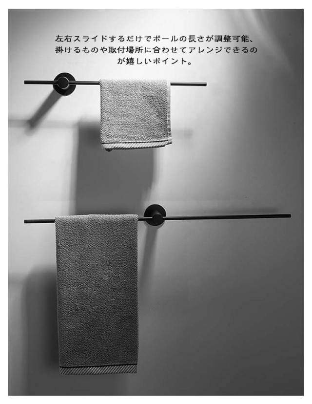 | ホテルのようなお洒落な空間を演出するタオルハンガー。 左右スライドするだけでポールの長さが調整可能、掛けるものや取付場所に合わせてアレンジできるのが嬉しいポイント。 ヘアターバンやカチューシャなど置き場所に困る小物が掛けられて使いやすさ抜群のタオル掛けです。 接着剤付属で穴あけ不要、女性一人でも簡単に取り付けることができるお洒落なタオルバーです。 | |