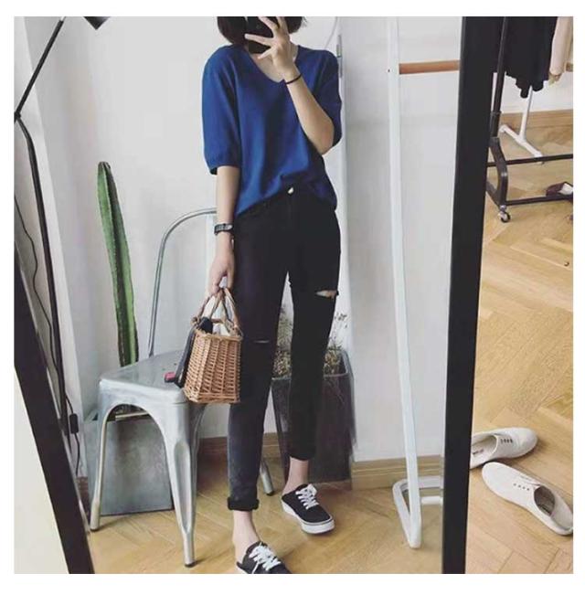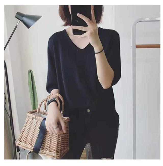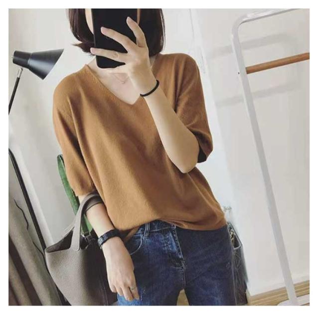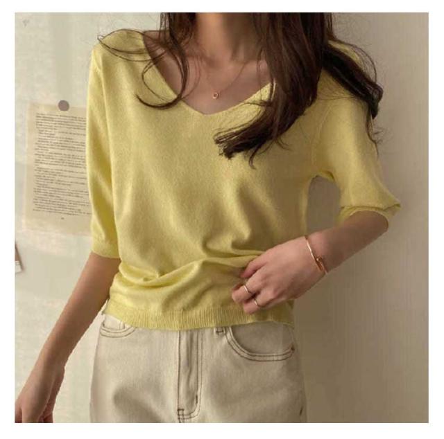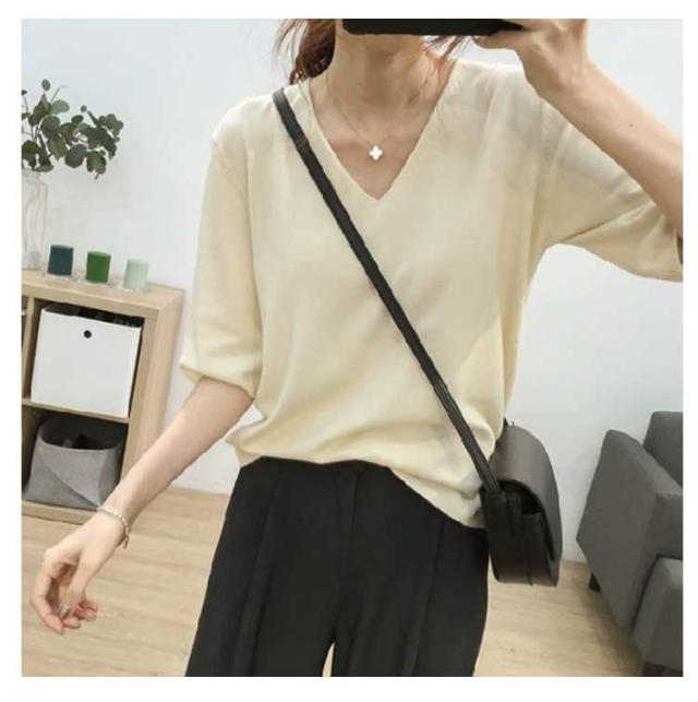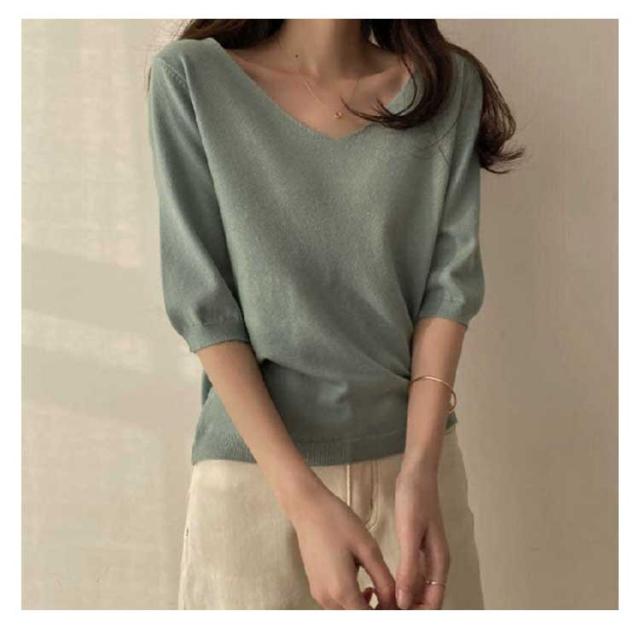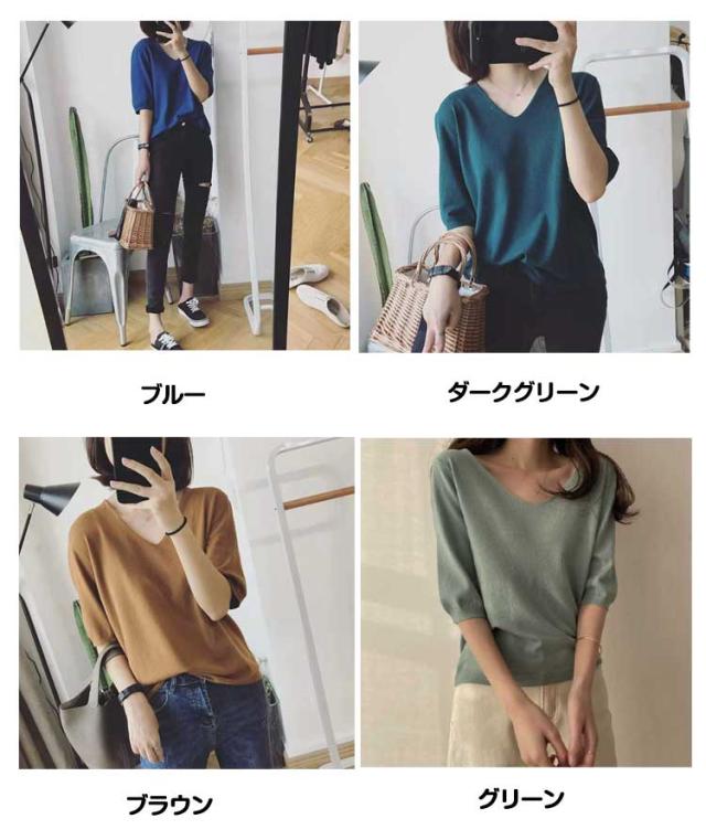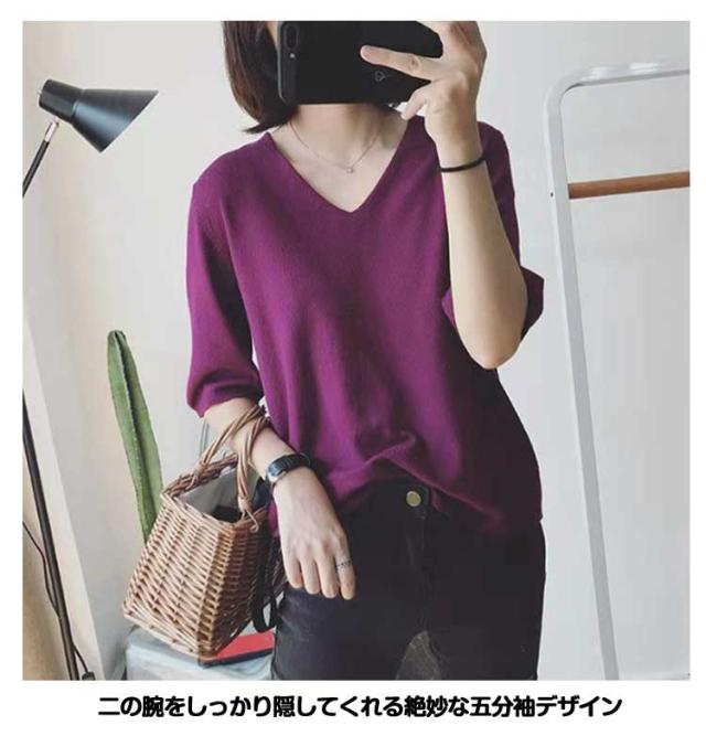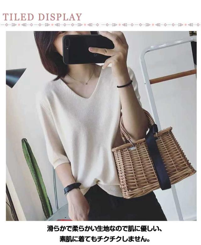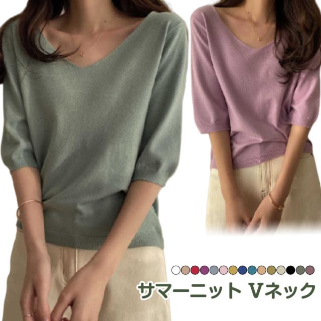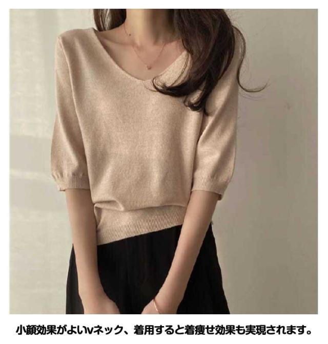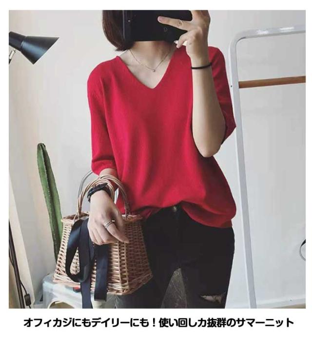| サマーニット vネック 滑らかで柔らかい生地なので肌に優しい、素肌に着てもチクチクしません。 小顔効果がよいvネック、着用すると着痩せ効果も実現されます。 オフィカジにもデイリーにも!使い回しカ抜群のサマーニット 二の腕をしっかり隠してくれる絶妙な五分袖デザイン | |