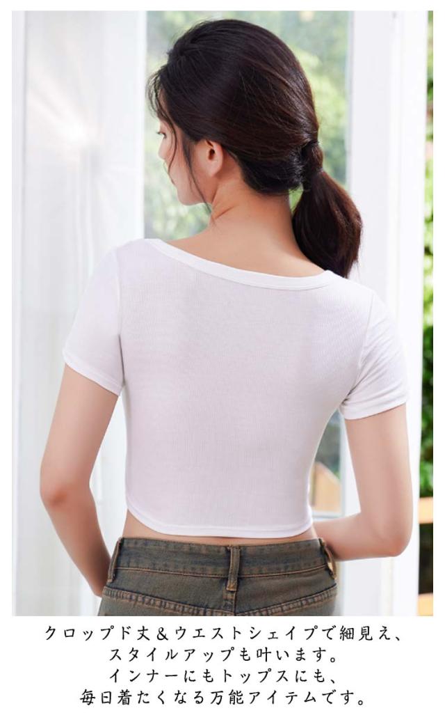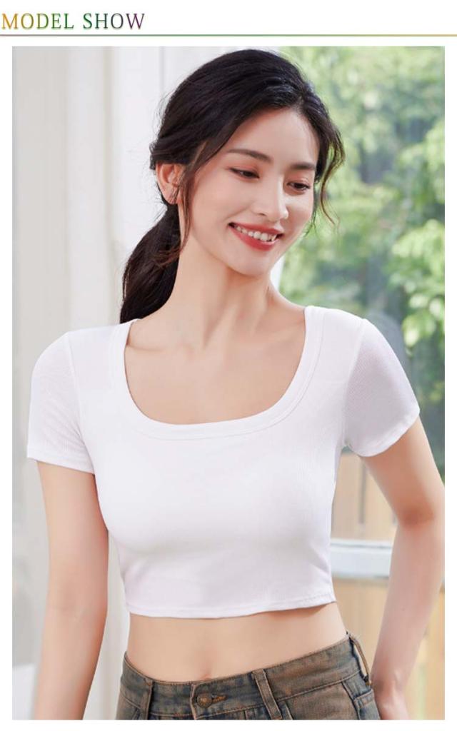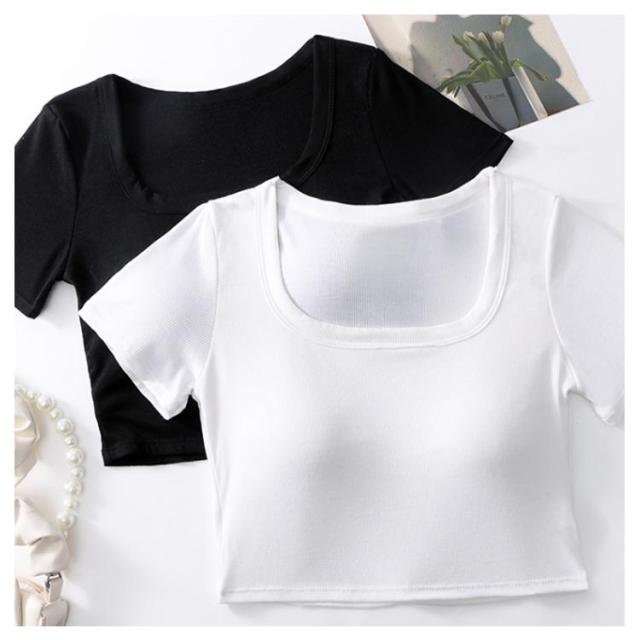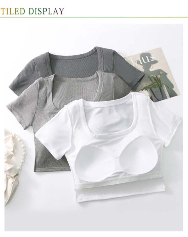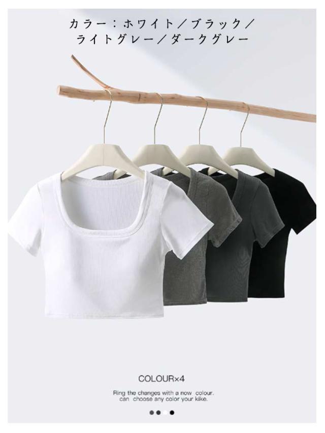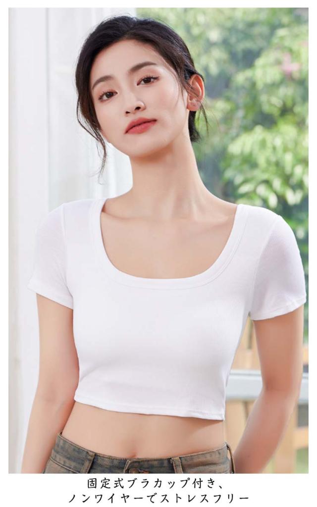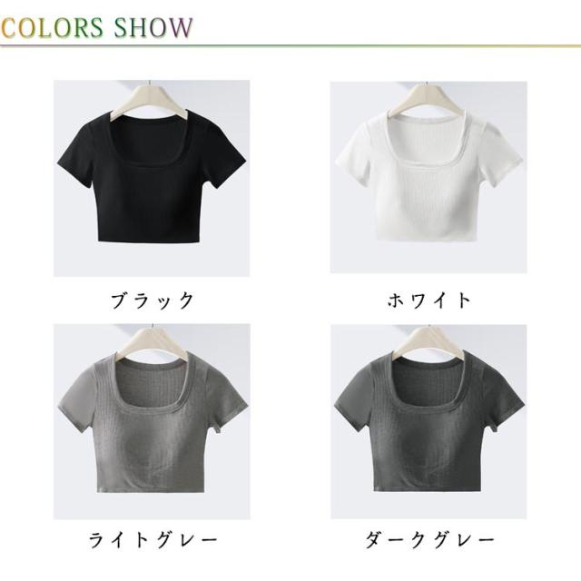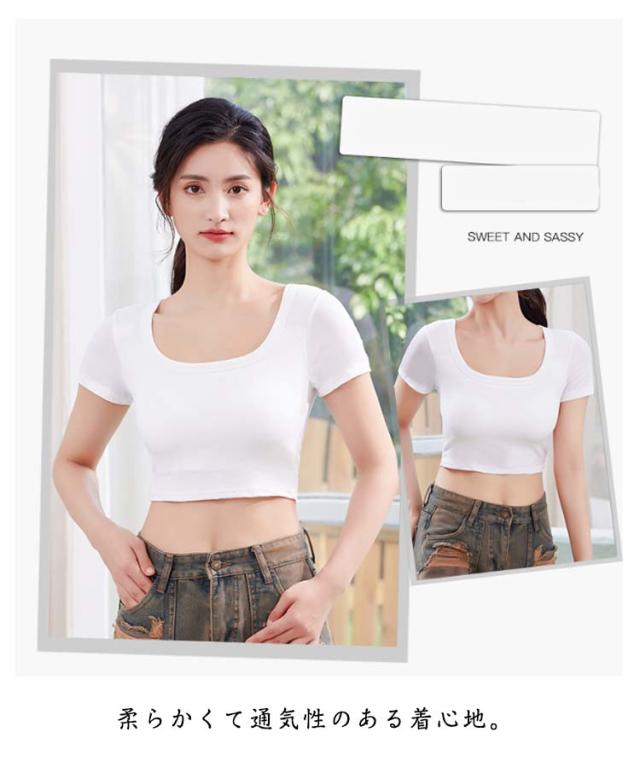 コットン リブ素材 綿 春夏用 レディース ヨガウェア トップス インナーシャツ 半袖 クロップド丈 スクエアネック ブラトップ Tシャツ カップ付きTシャツ 無地 シンプル スリム ストレッチ