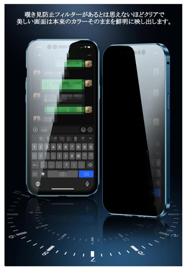 | ・大切な個人情報を覗き見から守るため前面のガラスが覗き見防止仕様へ進化しました。 ・画面は正面からでは限りなくクリアで鮮明な映り斜めにずれるほどぼんやりと見えづらくなります。 ・傷や摩耗に強くカメラレンズを下向きに置いても傷が付きにくい一体型なのでほこりの侵入も効果的に防ぐ事ができます。 ・ケースは本体と背面カメラレンズまで隙間なく覆いマグネット式でワンタッチ開閉ピッタリ完全密着します。 ・覗き見防止フィルターがあるとは思えないほどクリアで美しい画面は本来のカラーそのままを鮮明に映し出します。 ・滑らかな強化ガラスを使用して非常に繊細な操作性を実現、メッセージの入力や細かなゲーム操作に影響しません。 ・強化ガラスと軽量なアルミフレームで万が一の落下時に生じる衝撃エネルギーを分散する事ができしっかりと本体を保護します。 ・全面保護ケースながらまるでケースを装着していないかのような薄さ、iPhone特有のフォルムの美しさを維持しながらスムーズな操作。 ・全面保護一体型オールインワンケースでありながらメタルフレームによる電波の受信に影響はありません。 ・細部まで拘ったケースは本体とピッタリ隙間なくフィットします各ボタンや充電ポートなどの穴も正確でストレスなく使用できます。 ・従来の覗き見防止フィルムにあった顔認証への影響を無くしFace IDに対応、ケースを着けたままロックの解除が可能。 ・ケースを装着したままでもワイヤレス充電器の上に置くだけで充電することができます。 | |