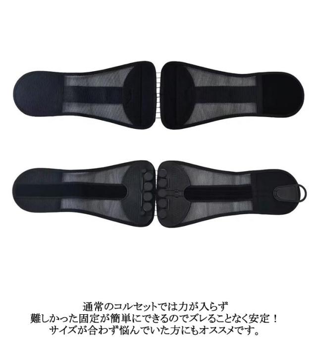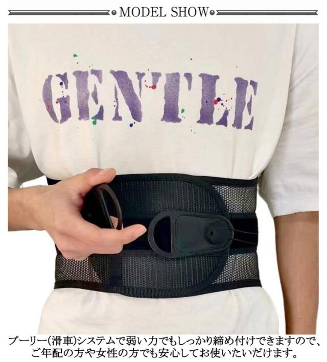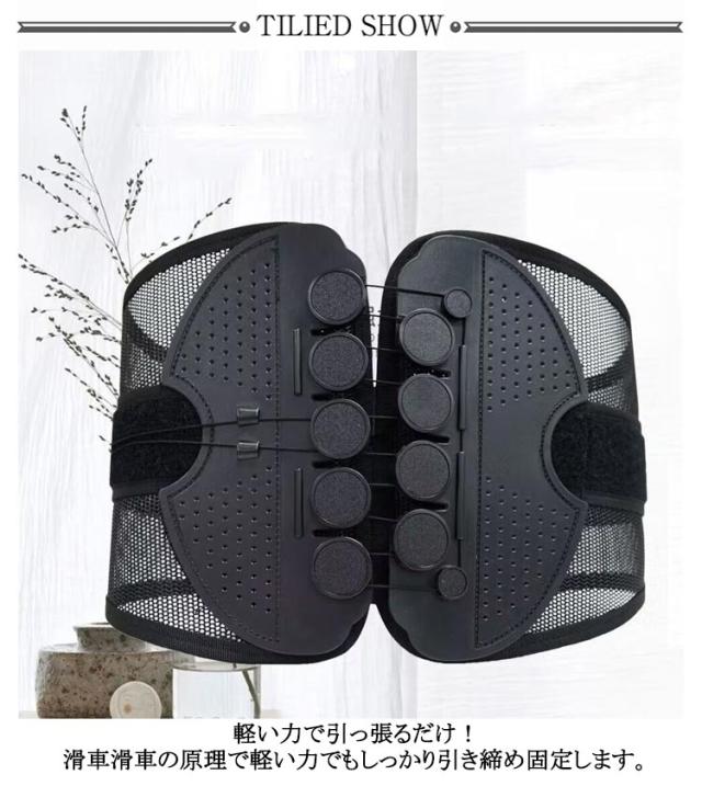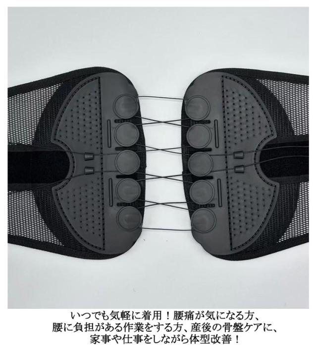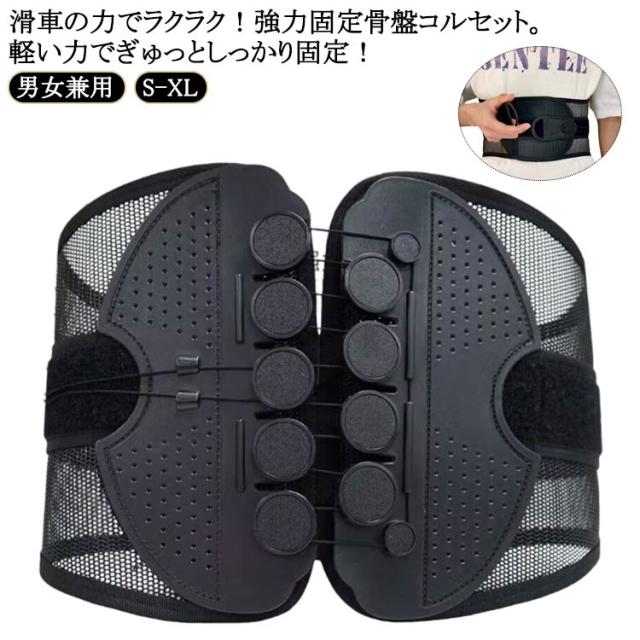 | 滑車の力でラクラク!強力固定 骨盤コルセット。軽い力でぎゅっとしっかり固定! プーリー(滑車)システムで弱い力でもしっかり締め付けできますので、ご年配の方や女性の方でも安心してお使いたいだけます。 軽い力で引っ張るだけ!滑車滑車の原理で軽い力でもしっかり引き締め固定します。 通常のコルセットでは力が入らず難しかった固定が簡単にできるのでズレることなく安定!サイズが合わず悩んでいた方にもオススメです。 着脱カンタン!着脱の難しいホックはなし!強力なマジックテープ仕様なので、簡単にしっかりと固定できます。 いつでも気軽に着用!腰痛が気になる方、腰に負担がある作業をする方、産後の骨盤ケアに、家事や仕事をしながら体型改善! 右手側のヒモを引くと上側が、左手側のヒモを引くと下側を締め付けます。上下それぞれで最適な締め具合に調整いただけます。 幅広タイプなので腰から骨盤まで広範囲をサポートします。 メッシュ素材で通気性バツグン。蒸れないから夏場でも快適にお使いいただけます。 | |