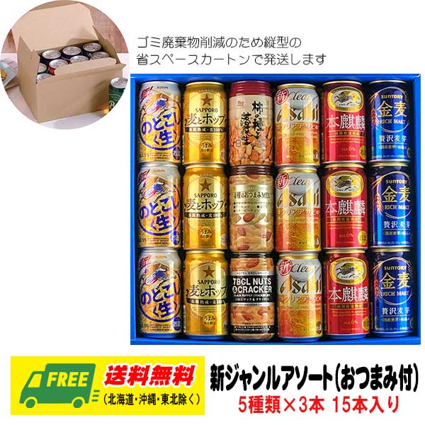 春ギフト セルフギフト オリジナルギフト 国産ビールメーカー 新ジャンル 5種 飲み比べ 15本セット(おつまみ付) 送料無料 プレゼント 御祝 内祝 誕生日