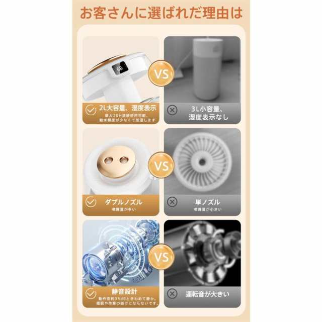 2L大容量:頻繁に給水が不要、一回の満給水で20時間連続加湿が可能