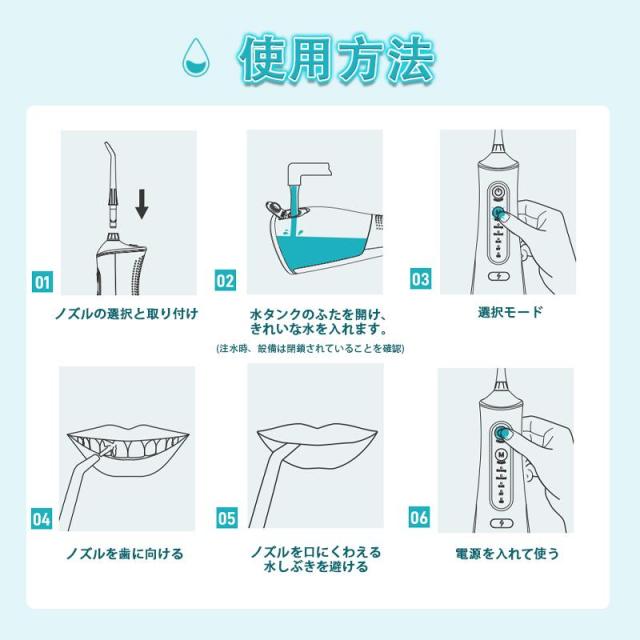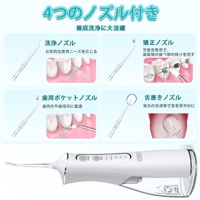 セットには標準ノズル、歯列矯正器用ノズル、歯周ポケット用ノズル、舌苔洗浄ノズル、4本ノズルが付属されています(歯ブラシのノズル、鼻洗浄ノズルを追加可能)。ジェット水流で日常の届きにくい歯周ポケット、歯並びの悪い所、矯正器具の周りなどの汚れをすっきり洗浄でき、虫歯、歯ぐき出血などを予防することもできます。