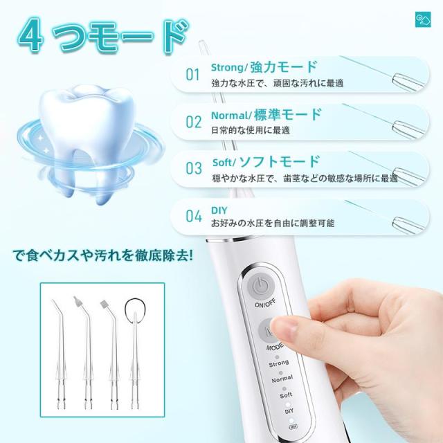 独自の超音波水流技術であるスーパージェット水流があり、歯垢除去率は99.9%に達しております。ジェットウォッシャーの振動ジェット周波数は1分間に1600・1800回になり、歯の隙間の汚れを徹底的に取り除き、歯と口を健康に保ち。歯ぐきの状態に合わせて強さが選べる5種類運転モード、4つのモードは、それぞれにStrong、Nornal、SoftとDIYです。ワンボタンでご自由に切り替えることができます。各モードは、それぞれに各口腔ケアのニーズを満たすために、各スプレー頻度と水流モードに対応します。 お客様がご自身のお好みによって、適切な水圧モードを選び、もっと快適な口掃除を行いましょう。敏感歯を持つ方々でも適用します。