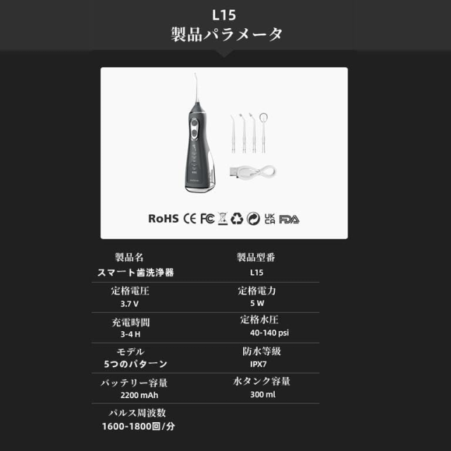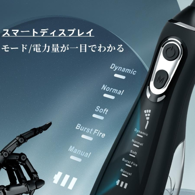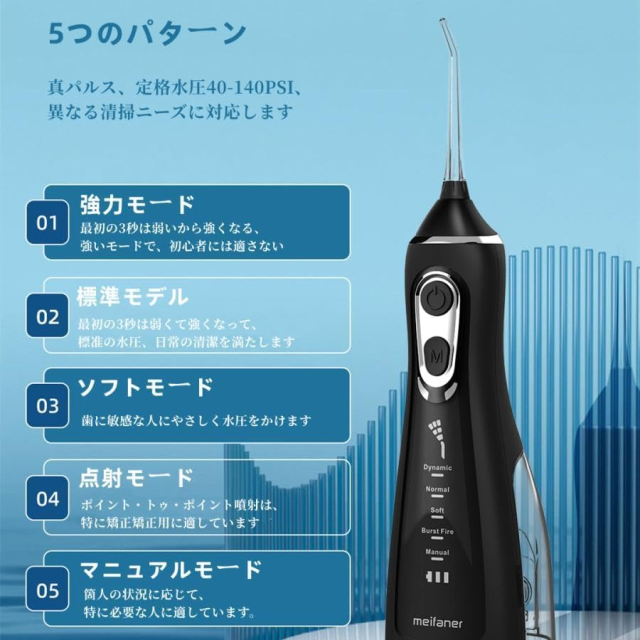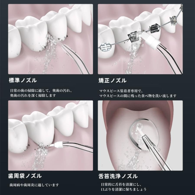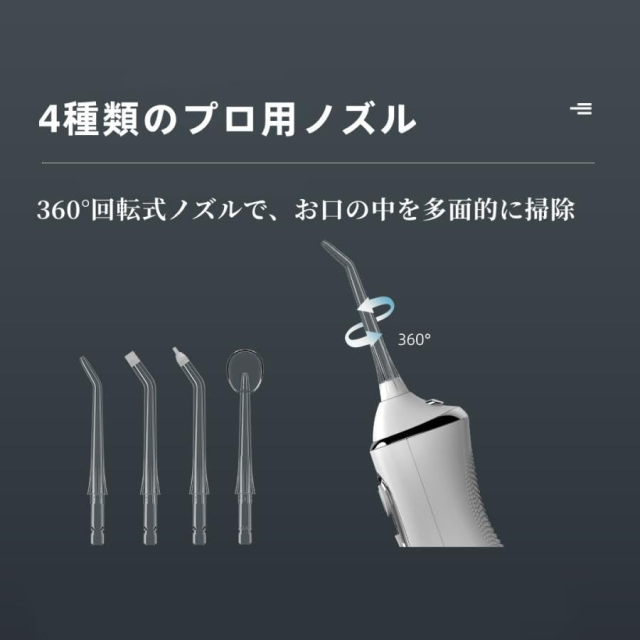 - パワフルな水流で歯の隙間をしっかり洗浄!3モード調整&5種類のノズル付きで、自分に合ったケアが可能。USB充電&長持ちバッテリーで頻繁な充電不要。IPX7防水設計でお風呂でも使え、タンクの取り外しも簡単。歯磨きだけでは物足りない方に最適なジェットウォッシャーです!
