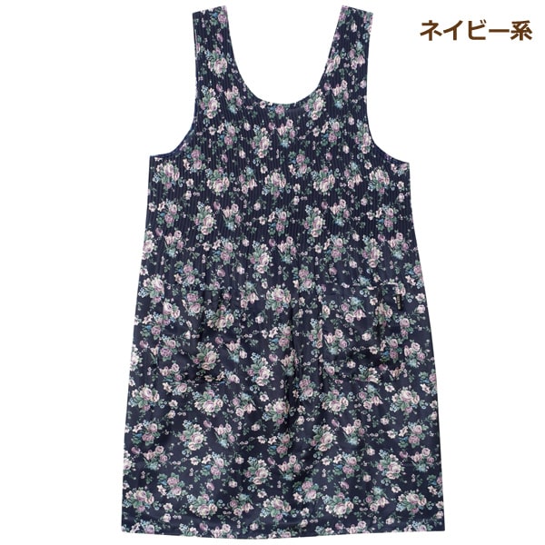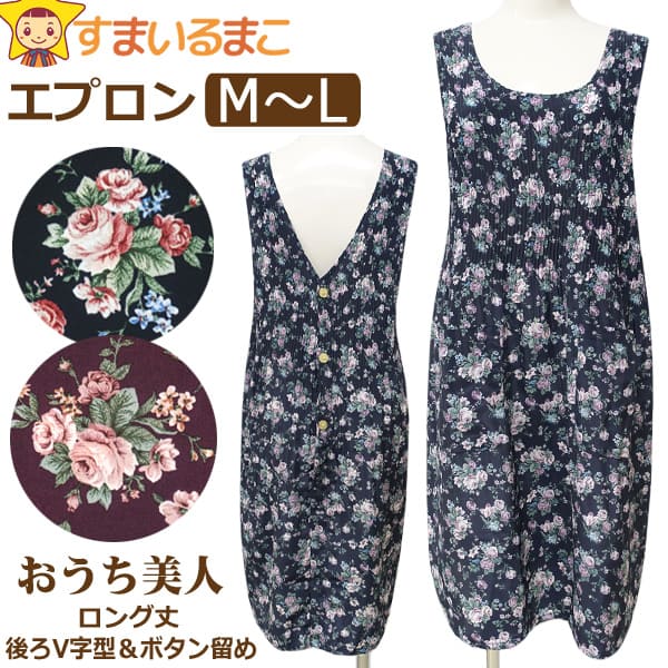 エプロン レディース 花柄 後ボタン プリーツ加工 ロング丈 コシボチリメン おうち美人 M〜L A-65986 ネコポス便は送料無料 婦人 女性 大人 プリーツエプロン 後釦 V字型 袖なし 前掛け 料理 掃除 料理教室 保育士 qw504