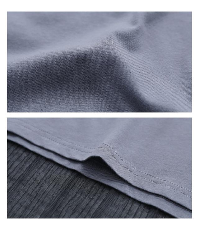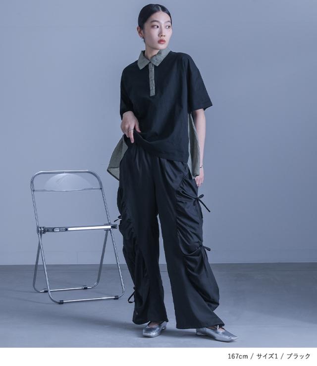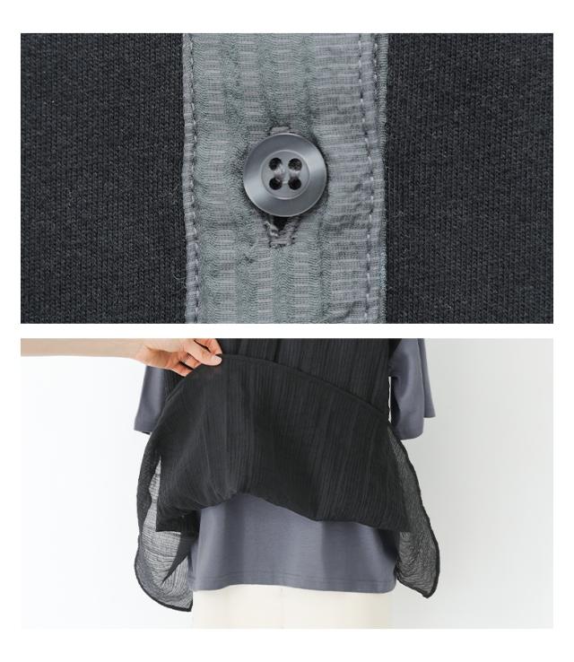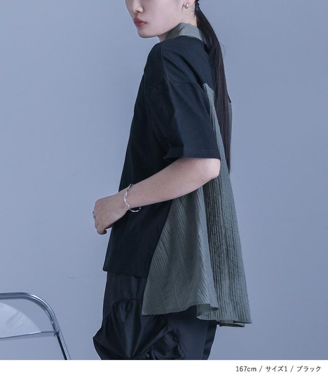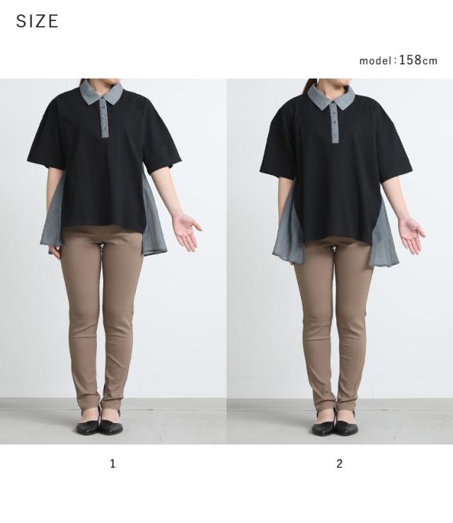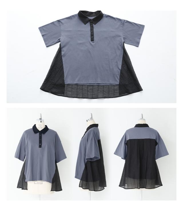 ■デザイン シアーストライプ生地をサイドにドッキングした異素材ポロシャツ。シアー生地はフレアシルエットで動きがあり、動くたびにふわりと揺れるシルエットの変化で軽やかさを演出します。前後差のある着丈でこなれ感があり、後ろ丈は長めなのでヒップ周りのカバーが叶うのも嬉しいポイントです。 ■コーディネート デザイン性がありながらも落ち着いた色味のカラー展開なので、様々なアイテムに合わせていただけます。シンプルなボトムスと合わせて程よく綺麗めな印象、スカートと合わせてほんのり女性らしい印象をプラス、デザイン性のあるボトムスと合わせてモードな印象が引き立つスタイルに。 ■素材 さらりとした肌触りのコットン100%素材を使用した天竺カットソー生地と、程よい透け感で清涼感のある布帛素材を使用したシアー生地を組み合わせた異素材生地。薄手の生地感とサイドのシアー生地で、暑い時期でも涼やかな着用が叶います。 |
