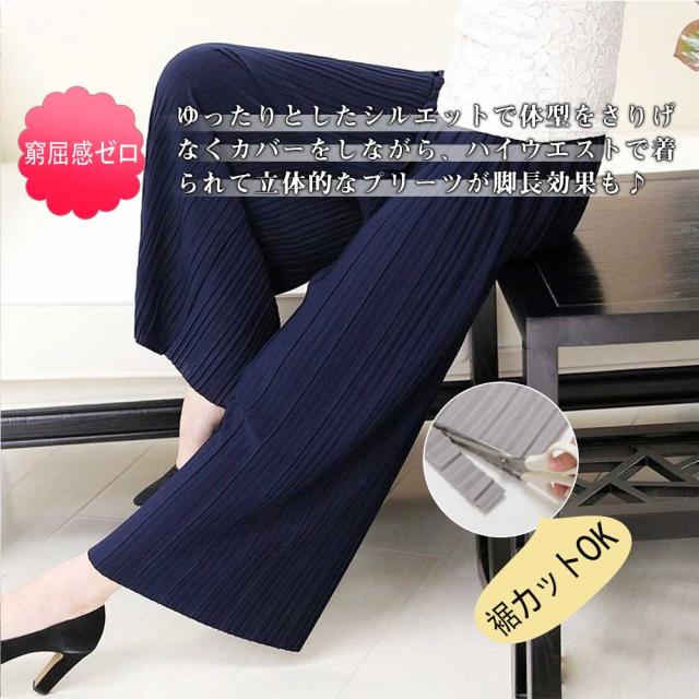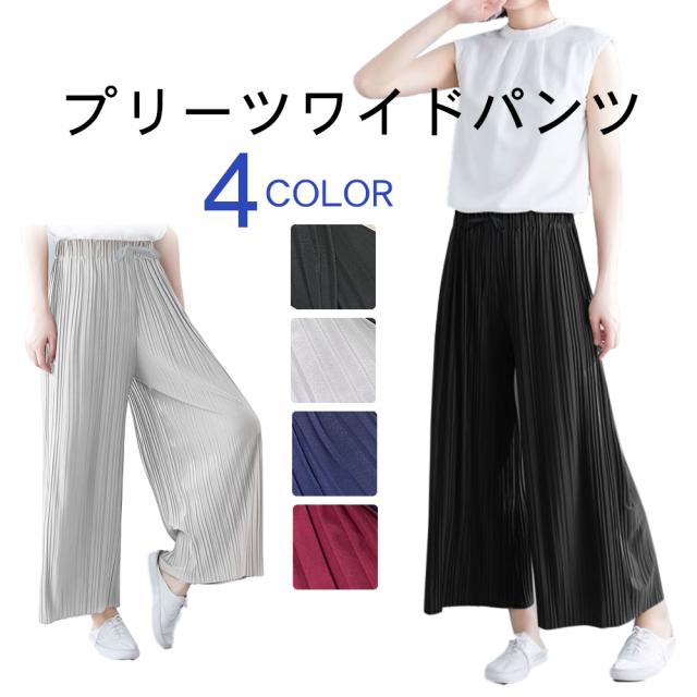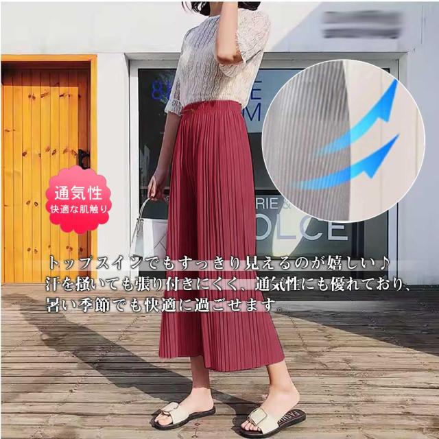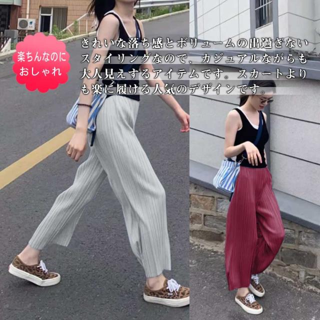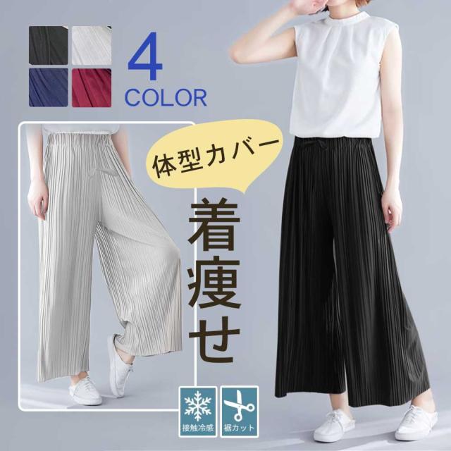 プリーツパンツ レディース セルフカット ロング 薄手 ひんやり 涼しい 韓国風 ワイドパンツ ガウチョパンツ ボトムス 春 夏