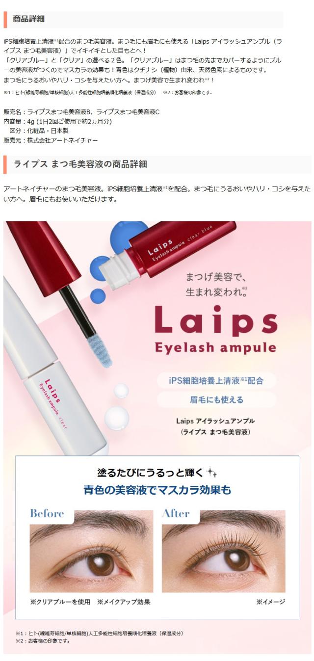 アートネイチャー まつ毛美容液 まつげ美容液 ライプス Laips アイラッシュ アンプル 4g 眉毛美容液 マツエク まつ毛ケア まつげ まゆ毛美容液 保湿 美容液 目元ケア まつ毛 下地 ボリューム クリア ブルー 日本製 母の日 公式