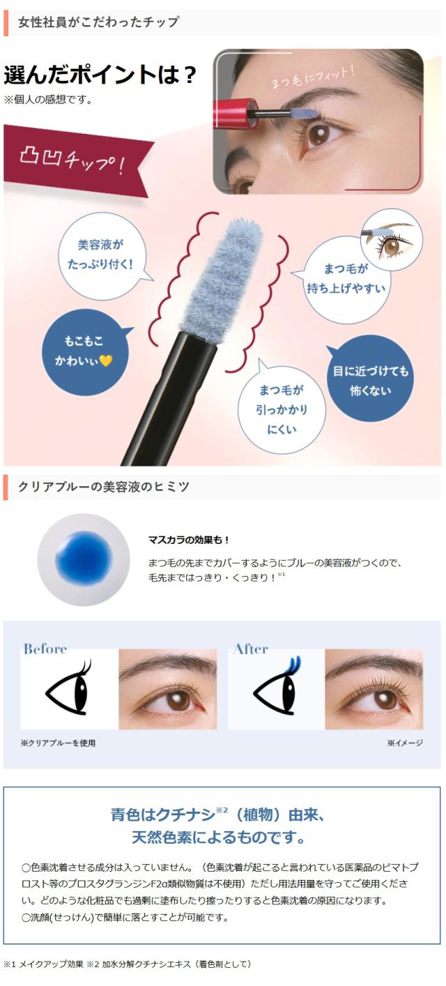 「クリアブルー」はまつ毛の先までカバーするようにブルーの美容液がつくのでマスカラの効果も!青色はクチナシ(植物)由来、天然色素によるものです。