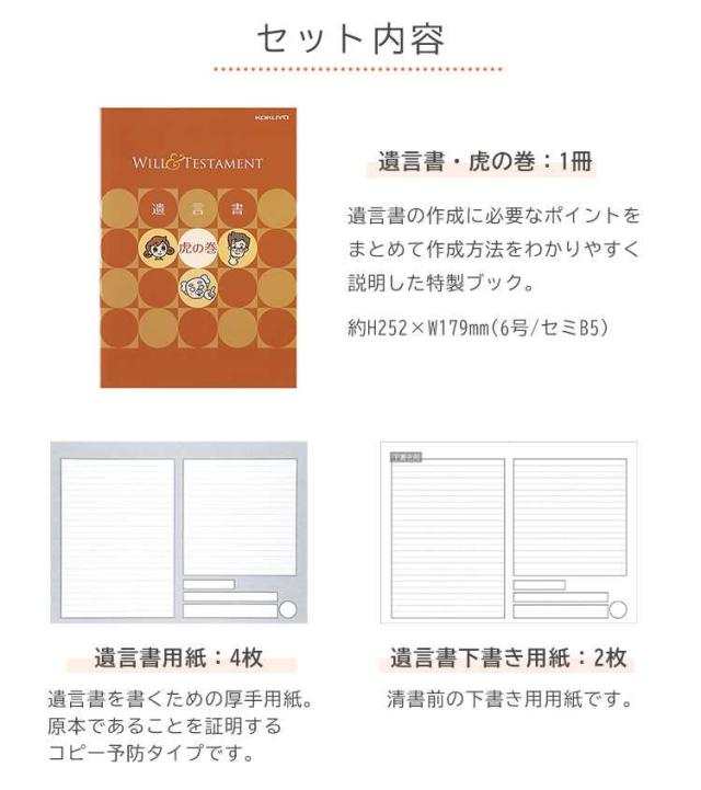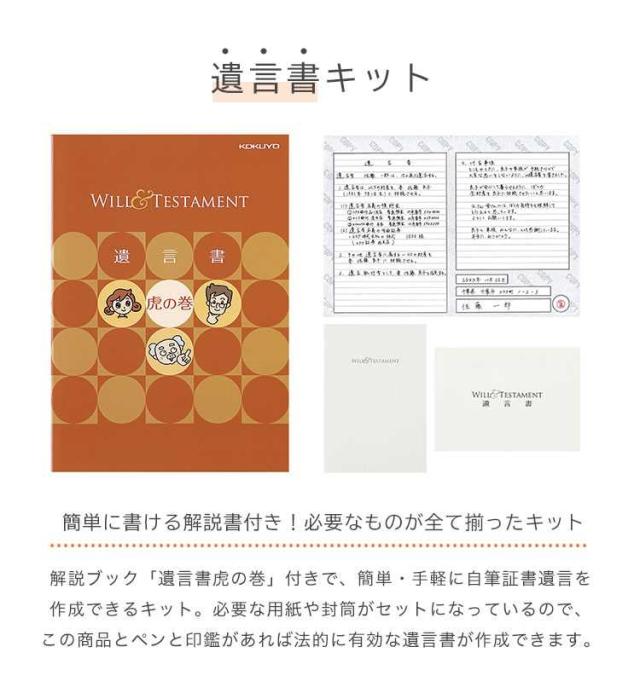 Details 【遺言書キット】 財産が特になくても、まだ若くても、家族のために遺言書は必要です!初めてでもよくわかる解説ブック「遺言書虎の巻」付きの「遺言書キット」で守るべきルールをわかりやすく説明し、手軽に自筆証書遺言を作成できるキット。必要な用紙や封筒がセットになっているので、この商品とペンと印鑑があれば法的に有効な遺言書が作成できます。 ブランド名 コクヨ / KOKUYO 品番 LES-W101N サイズ 約H252×W179mm(6号/セミB5) セット内容 ・遺言書虎の巻:1冊 ・遺言書用紙:4枚 ・遺言書下書き用紙:2枚 ・封印用封筒:1枚 ・保管用台紙:1枚 重量 約320g 生産国 日本 ご注意 ※当商品は、2020年12月現在の法令等に基づいて制作しております。 ※当商品で提供する情報や内容を利用することで生じた、いかなる損害および問題に対しても、弊社では一切の責任を負いかねますので、ご了承ください。 ※表記サイズより、多少の誤差があることがございます。 ※商品の画像はできる限り実物に近づけるよう配慮しておりますが、お使いのモニターやご覧になる環境によりましてはカラーの見え方に差が出る場合がございます。ご了承くださいませ。 ※メール便発送の場合タグを切ってパッケージから出して発送する場合があります。ご了承くださいませ。 関連キーワード 遺言書キット コクヨ KOKUYO 遺言書虎の巻ブック付き 遺言書 書き方 サポート 解説 ガイド テンプレート 終活 遺言用紙 相続記録 エンディングノート 老後 身辺整理 生前整理 LES-W101N 簡単 すぐ作れる わかりやすい 書きやすい シンプル 自筆証書遺言 遺言書保管制度対応 遺言書セット おすすめ 遺言書用紙 封印用封筒 初めて 気軽 手軽 家族 両親 祖父母 親族 夫婦 親子 父の日 母の日 敬老の日 贈り物 プレゼント 20代 30代 40代 50代 60代 70代 80代 息子 娘 女性 男性 父 母 おかあさん おとうさん パパ ママ シニア おじいちゃん おばあちゃん お爺ちゃん お婆ちゃん 祖父 祖母 じいじ ばあば バースデー 誕生日 プレゼント プチ ミニ ギフト | ||||||||||||||||