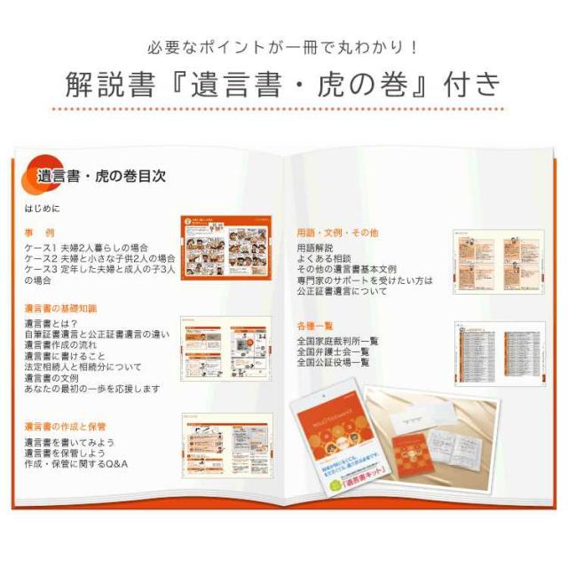 財産が特になくても、まだ若くても、家族のために遺言書は必要です!初めてでもよくわかる解説ブック「遺言書虎の巻」付きの「遺言書キット」で守るべきルールをわかりやすく説明し、手軽に自筆証書遺言を作成できるキット。必要な用紙や封筒がセットになっているので、この商品とペンと印鑑があれば法的に有効な遺言書が作成できます。