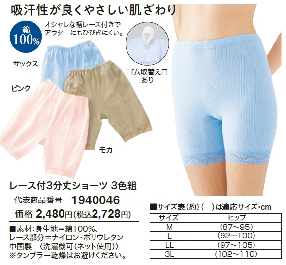 レース付3分丈ショーツ 3色組 ショーツ パンツ 綿100% セット コットン レディース 婦人服 ミセス シニア 女性 ピンク ブルー ベージュ 深履き 青 水色 薄茶色 桃色 シンプル 汗 対策 ファッション 40代 50代 60代 70代 80代 90代 母の日 お母さん おばあちゃん dz p27190