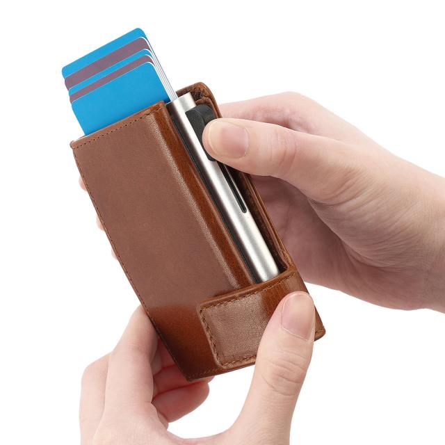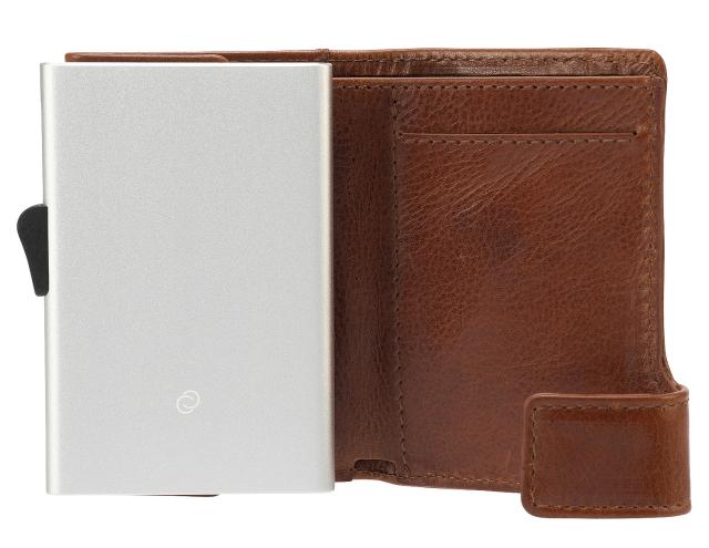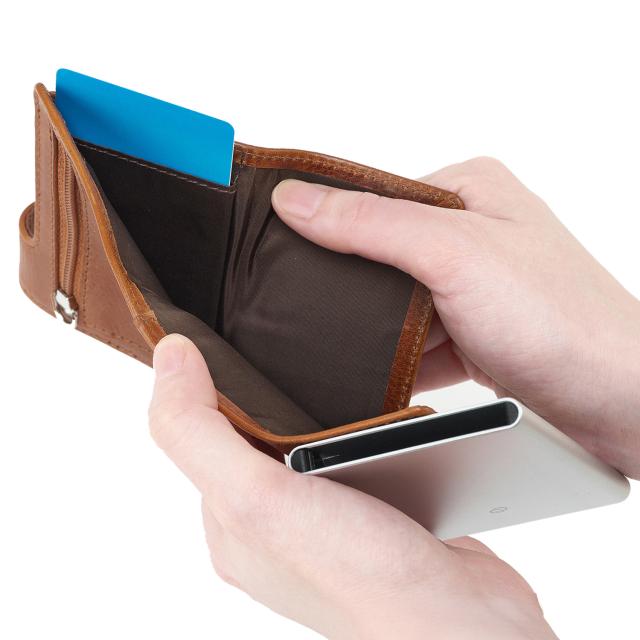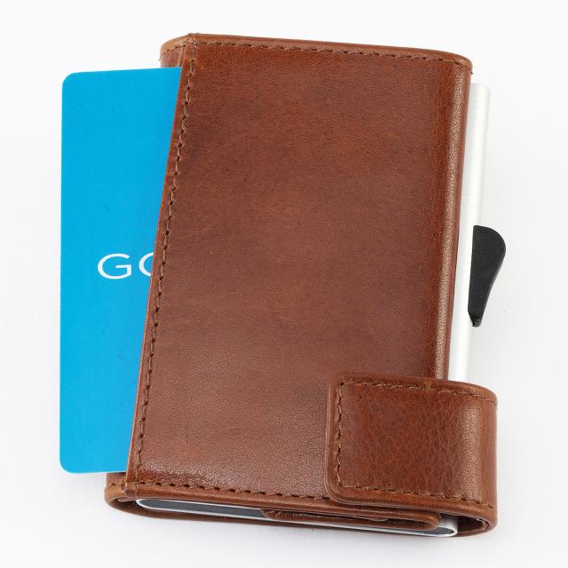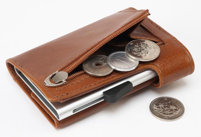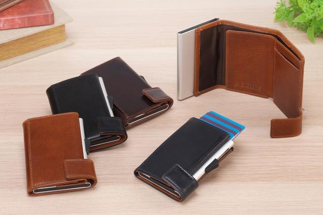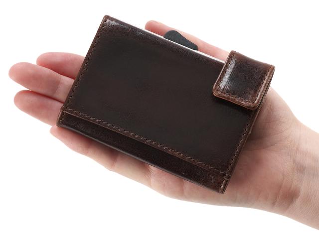 ●ワンプッシュでカードがスライドするオランダ生まれのアルミニウムカードホルダーを内蔵したコンパクトサイズの三つ折り財布。