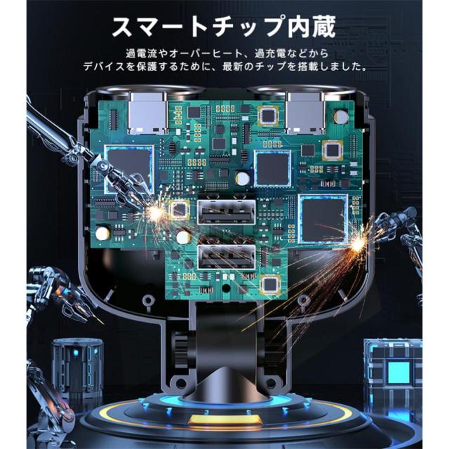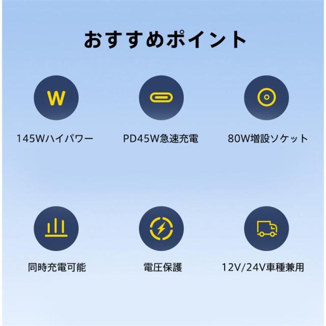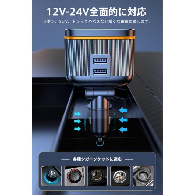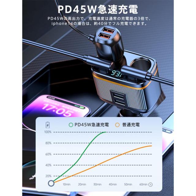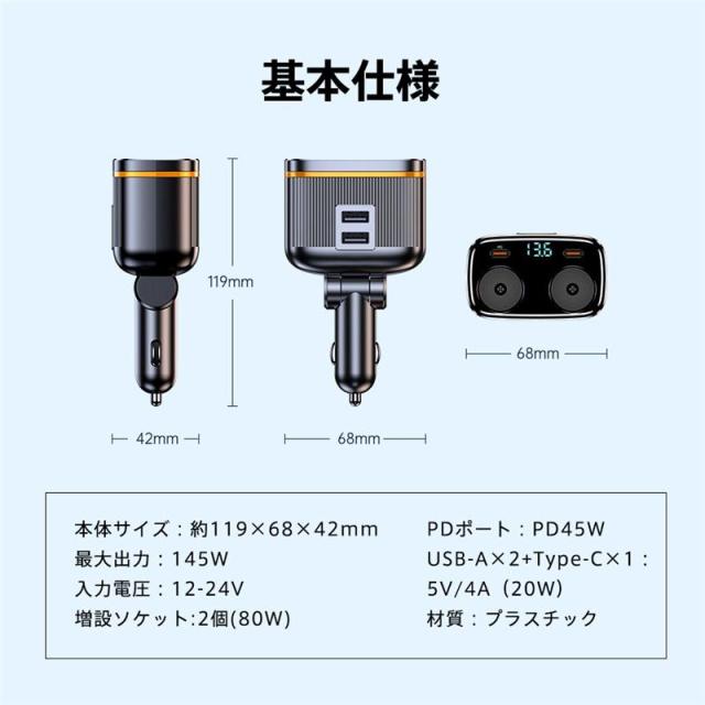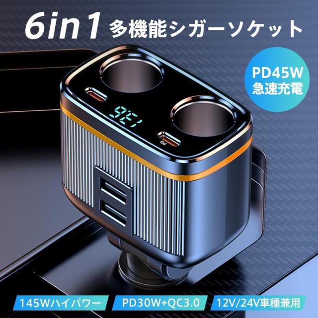 シガーソケット 2連 6in1 usbポート 145W ハイパワー 増設ソケット 車載充電器 PD45W 急速 12V/24V トラック 独立スイッチ