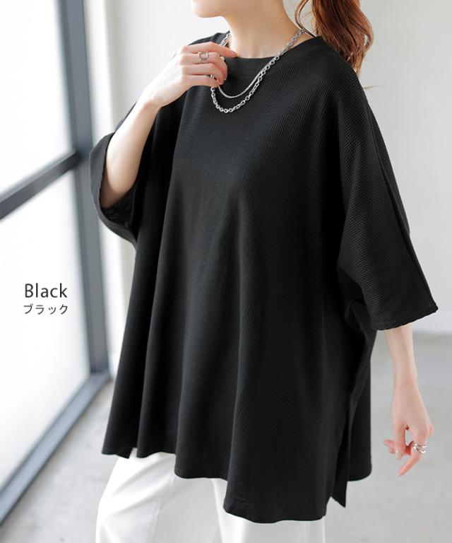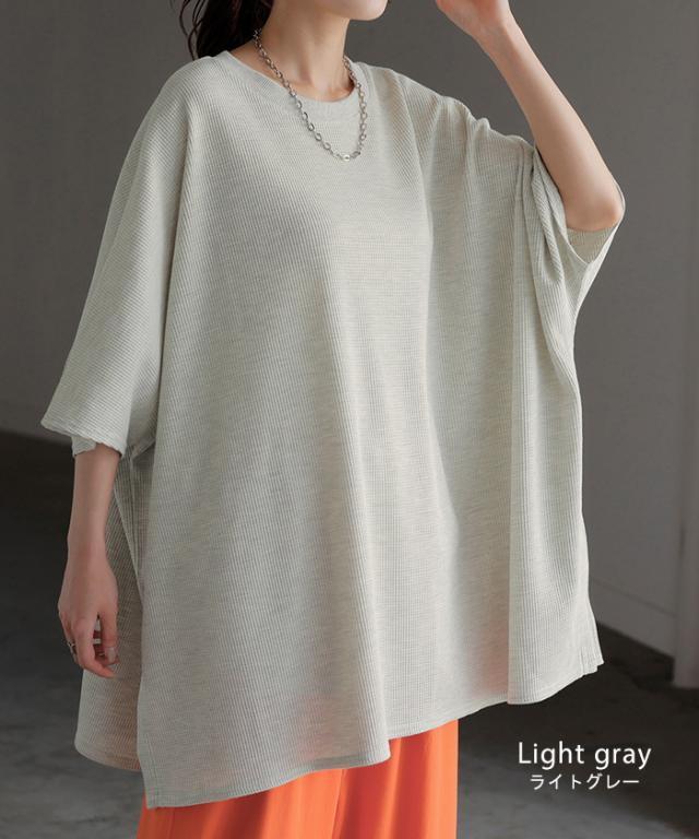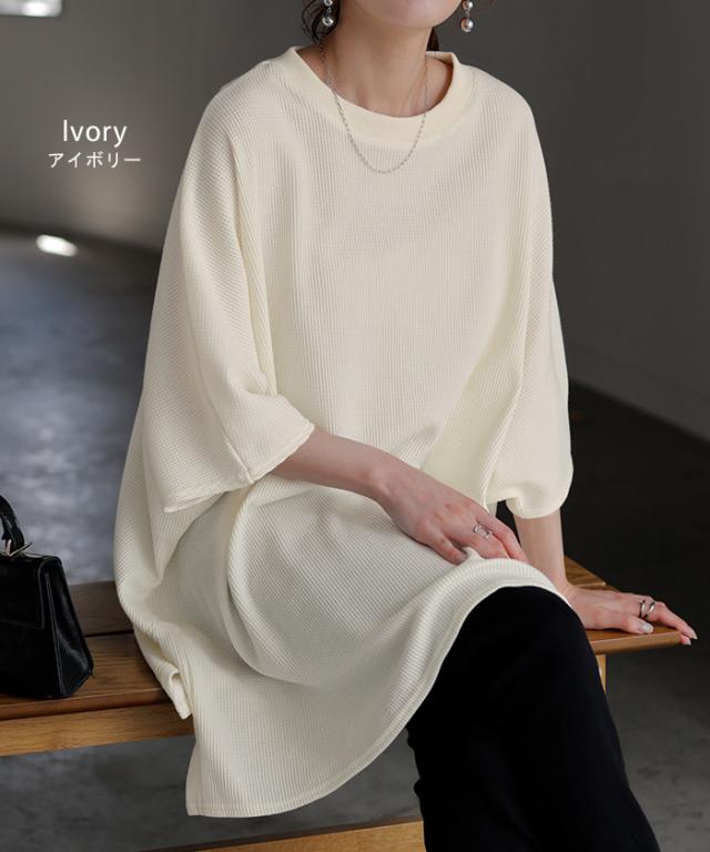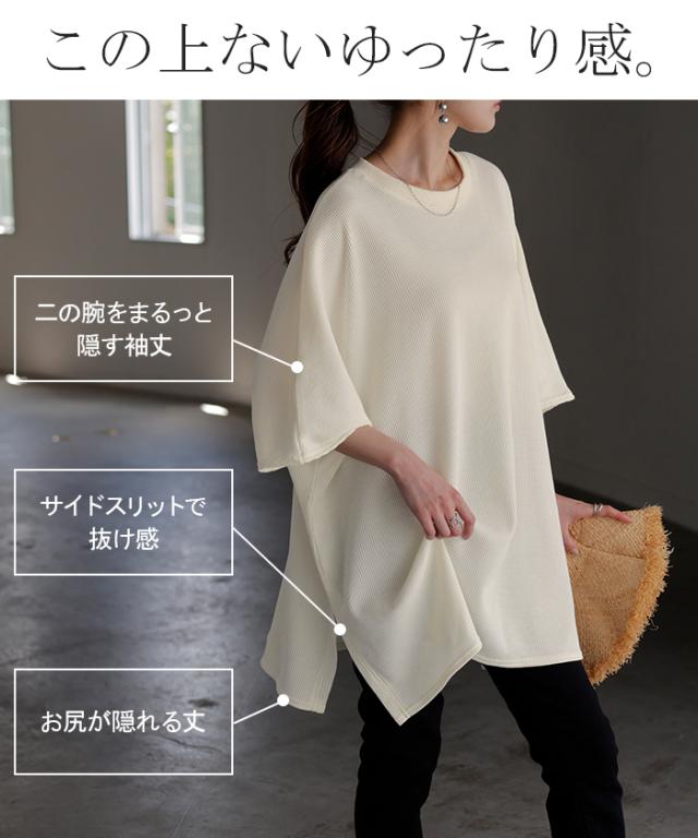 Tシャツ ワッフル ドルマン レディース トップス 半袖 ロング ティーシャツ チュニック ビッグ クルーネック 長い ドルマンスリーブ オーバー ゆったり 無地 別売り セットアップ 可 体型カバー お尻が隠れる 大きいサイズ 白 黒 春 夏 HUG.U