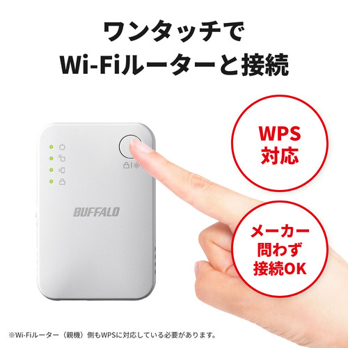 まずは本商品のWPSボタンを約2秒間プッシュ、次に現在お使いのWi-Fiルーター(無線LAN親機)のWPSボタンをプッシュして設定完了。 Wi-Fiルーター(無線LAN親機)の設定を引き継ぐので、今まで使っていたスマホやタブレット、パソコンといったWi-Fi対応機器の設定を変更する必要はありません。 他社製のWi-Fiルーター(無線LAN親機)をお使いの場合も、WPS対応であれば本商品をお使いいただけます。※ご利用中のWi-Fiルーター(無線LAN親機)の仕様は、各メーカーにお問い合わせください。