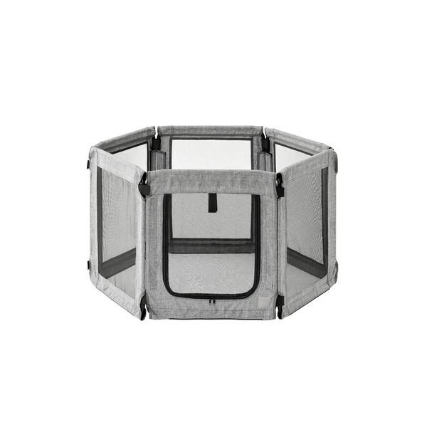 わんちゃんがなめても安心、破れにくいPVCメッシュ素材採用はぶつかっても体への衝撃を抑え、スチールタイプだから倒れにくい。