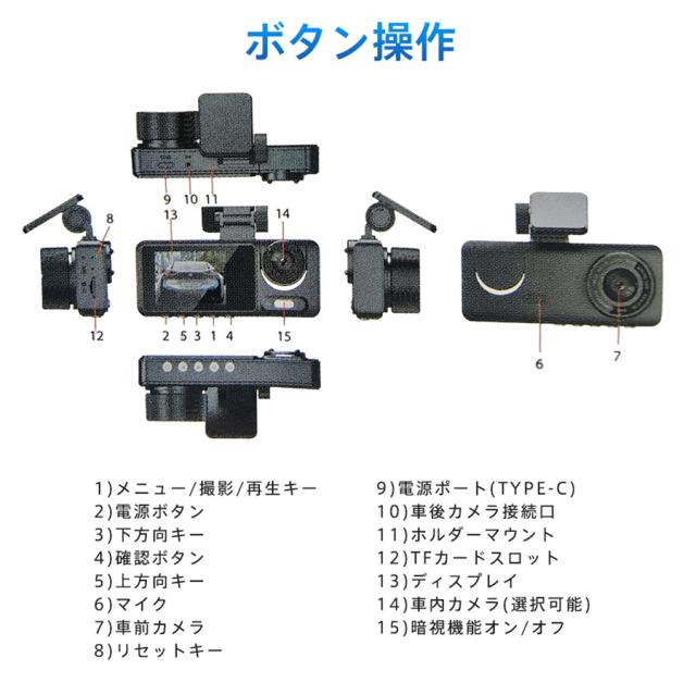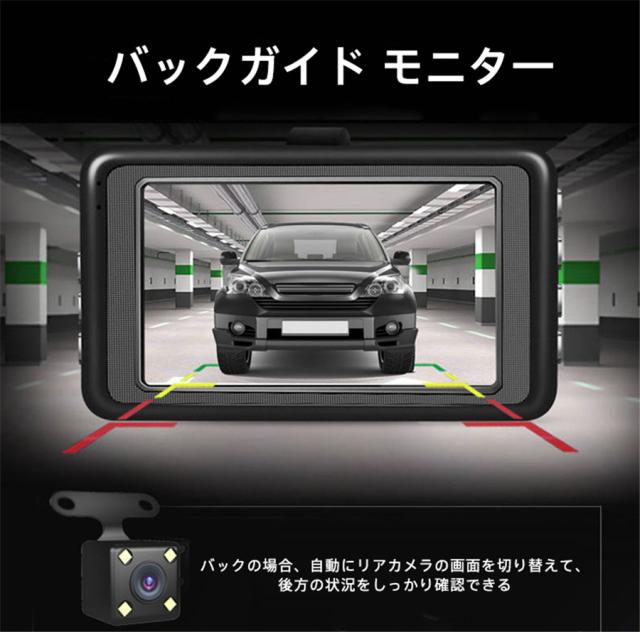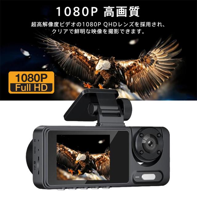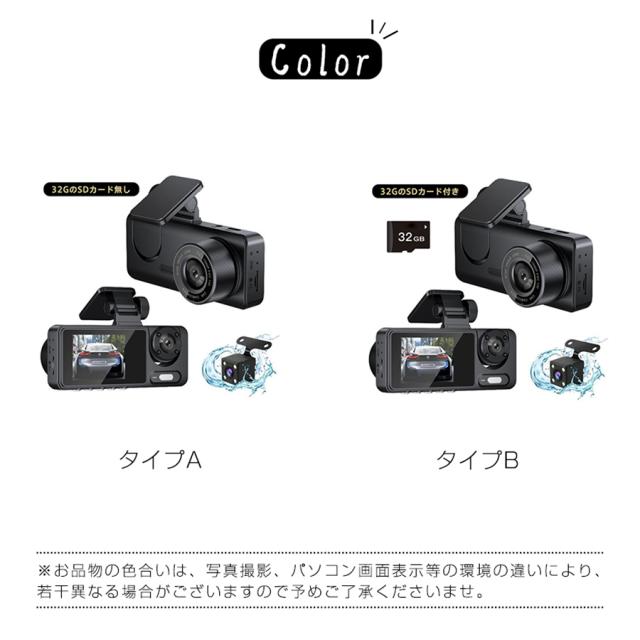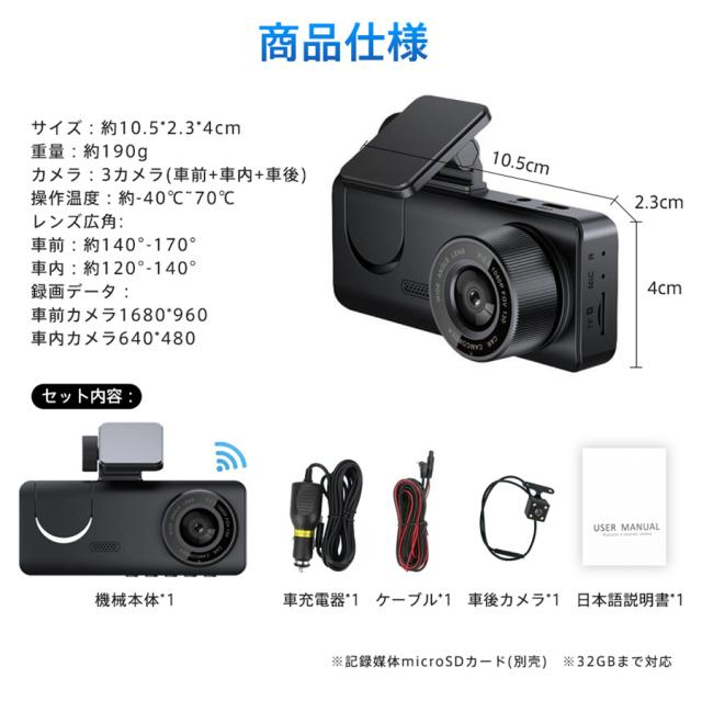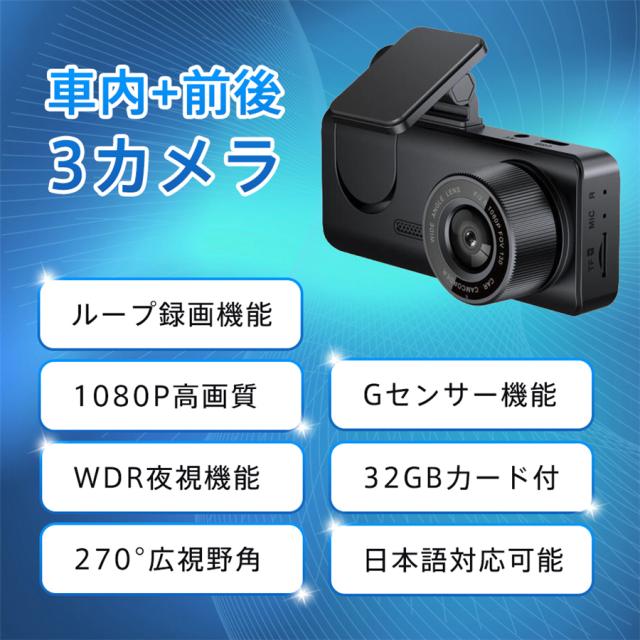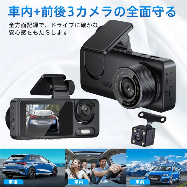 ドライブレコーダー 3カメラ バックカメラ 広範囲 SDカード選択可 同時録画 前後 車内 ループ録画 暗視ライト 連動 繰り返し