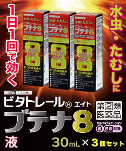 「ビタトレール ブテナ8液」は8つの有効成分が水虫のつらい諸症状を鎮め、1日1回の使用でよく効きます。