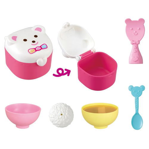 メルちゃんにごはんとお味噌汁を食べさせてね? ごはんをいれた炊飯器をぱかっとあけて、しゃもじですくってお茶碗にごはんをよそえます。 お味噌汁のわかめと豆腐が本物みたいに動きます。
