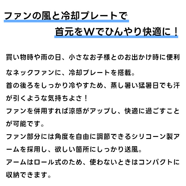 買い物時や雨の日、小さなお子様とのお出かけ時に便利なネックファンに、冷却プレートを搭載。首の後ろをしっかり冷やすため、 蒸し暑い猛暑日でも汗が引くような気持ちよさ!
